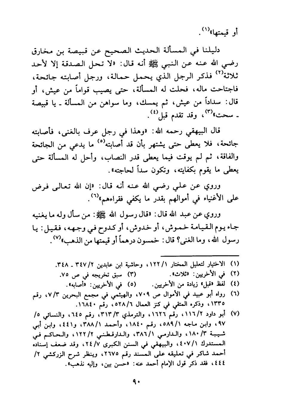 وَرُوِيَ عَن عبد الله قَالَ: " قَالَ رَسُول الله - صَلَّى اللَّهُ عَلَيْهِ وَسَلَّم َ -: من سَأَلَ وَله مَا يُغْنِيه جَاءَ يَوْم الْقِيَامَة خموش، أَو خدوش، أَو كدوح فِي وَجهه، فَقيل: يَا رَسُول الله، وَمَا الْغنى؟ قَالَ: خَمْسُونَ درهما أَو قيمتهَا من الذَّهَب ".
