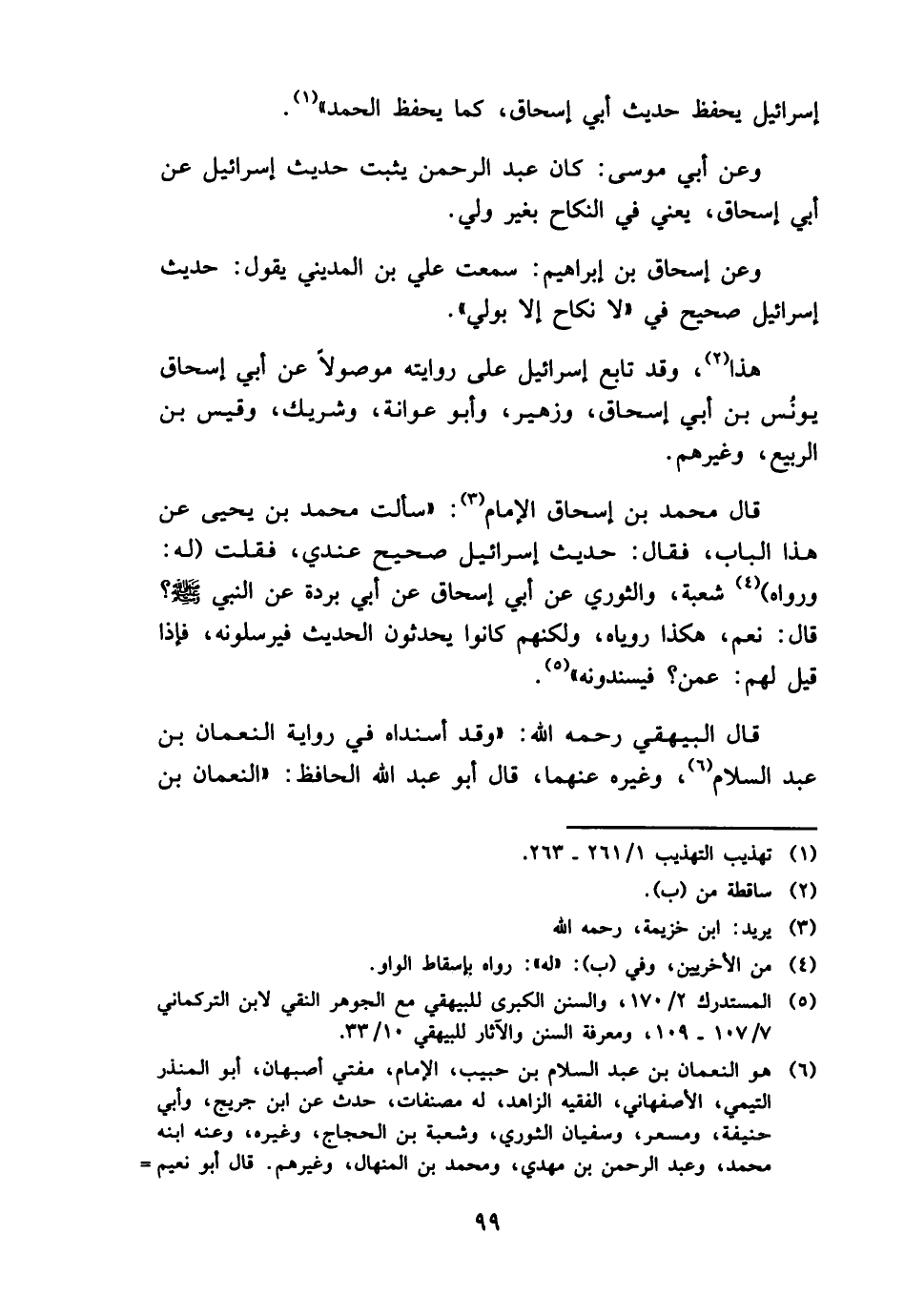 وَعَن أبي مُوسَى: كَانَ عبد الرَّحْمَن يثبت حَدِيث إِسْرَائِيل عَن أبي إِسْحَاق، يَعْنِي فِي النِّكَاح بِغَيْر ولي.