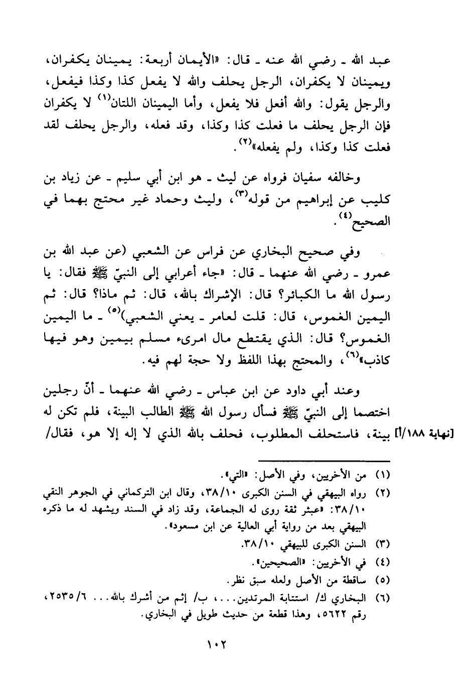 وَفِي صَحِيح البُخَارِيّ عَن فراس عَن الشّعبِيّ (عَن عبد الله بن عَمْرو - رَضِي الله عَنْهُمَا - قَالَ: " جَاءَ أَعْرَابِي إِلَى النَّبِي ّ فَقَالَ: يَا رَسُول الله مَا الْكَبَائِر؟ قَالَ: الْإِشْرَاك بِاللَّه، قَالَ: ثمَّ مَاذَا؟ قَالَ: ثمَّ الْيَمين الْغمُوس، قَالَ: قلت لعامر: يَعْنِي الشّعبِيّ) - مَا الْيَمين الْغمُوس؟ قَالَ: الَّذِي يقتطع مَال امْرِئ مُسلم بِيَمِين وَهُوَ فِيهَا كَاذِب "، والمحتج بِهَذَا اللَّفْظ وَلَا حجَّة لَهُم فِيهِ.