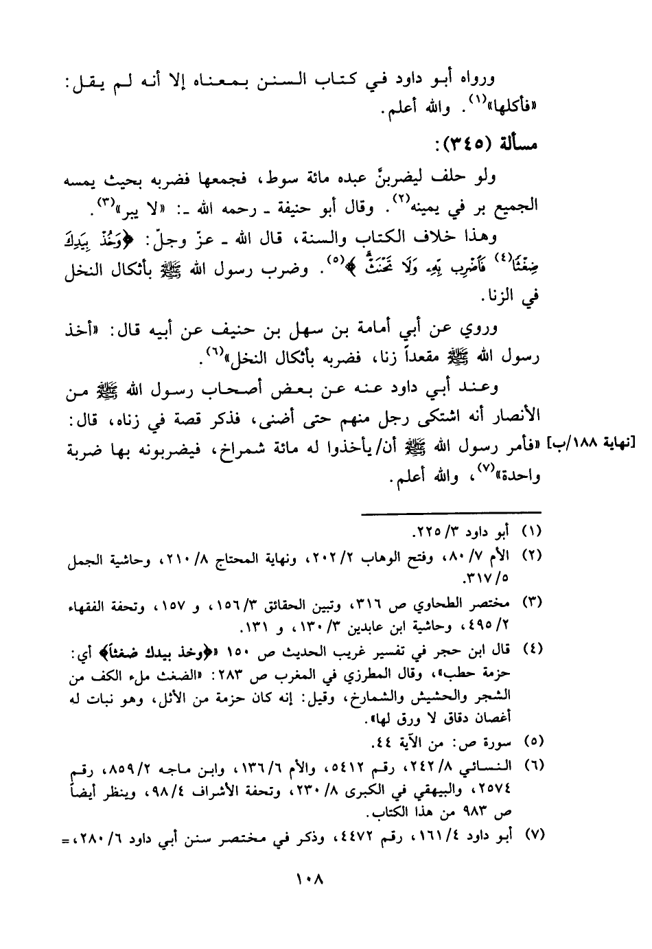 وَهَذَا خلاف الْكتاب وَالسّنة، قَالَ الله - عزّ وجلّ: {وخُذْ بِيَدِكَ ضَغْثاً فَاضْرِبْ وَلاَ تَحْنُثْ} وَضرب رَسُول الله - صَلَّى اللَّهُ عَلَيْهِ وَسَلَّم َ - بأثكال النّخل فِي الزِّنَا.