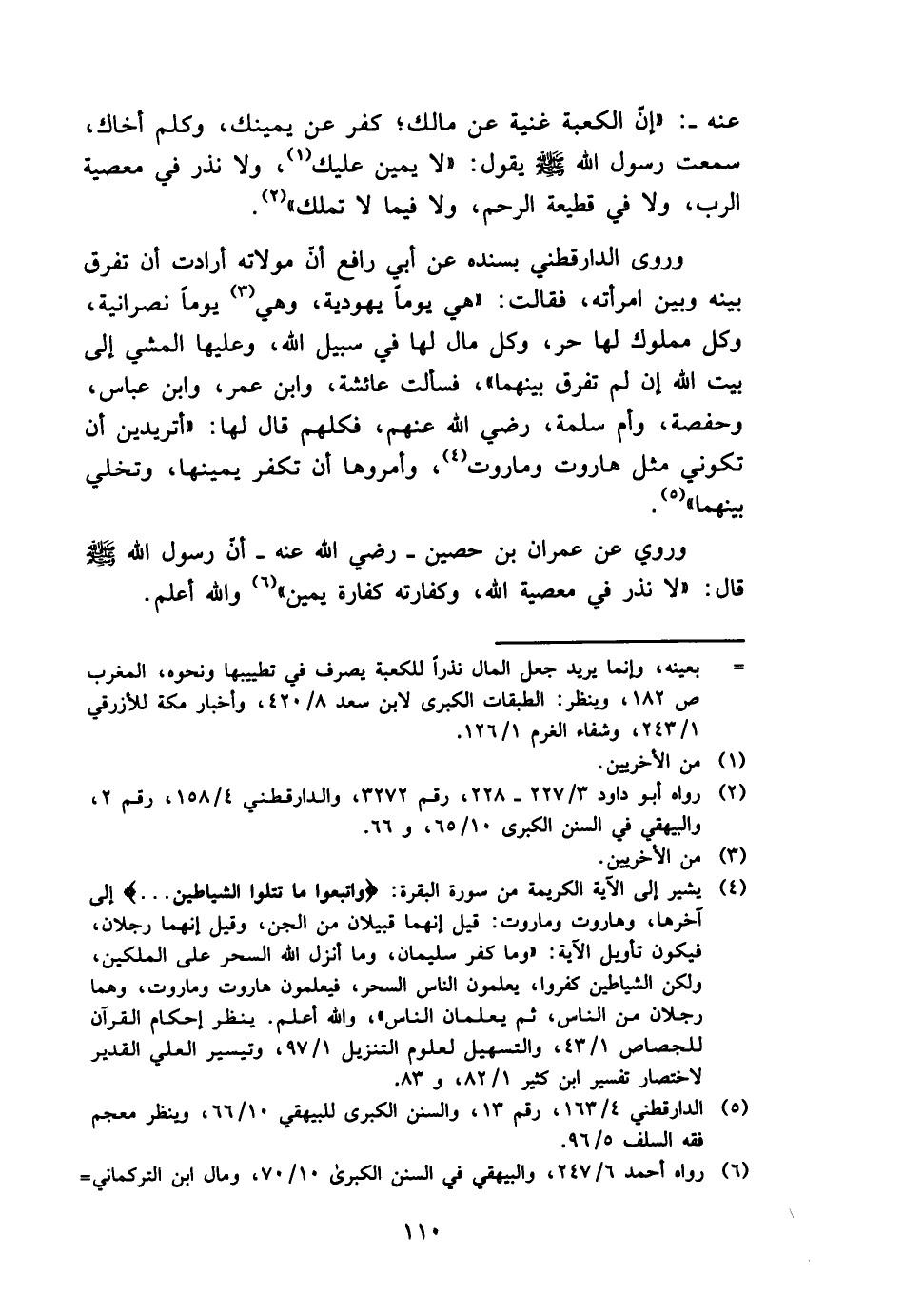 عَنهُ: " إنّ الْكَعْبَة غنية عَن مَالك؛ كفر عَن يَمِينك، وكلم أَخَاك، سَمِعت رَسُول الله - صَلَّى اللَّهُ عَلَيْهِ وَسَلَّم َ - يَقُول: " لَا يَمِين عَلَيْك، وَلَا نذر فِي مَعْصِيّة الرب، وَلَا فِي قطيعة الرَّحِم، وَلَا فِيمَا لَا تملك ". وروى الدَّارَقُطْنِيّ بِسَنَدِهِ عَن أبي رَافع أنّ مولاته أَرَادَت أَن تفرق بَينه وَبَين امْرَأَته، فَقَالَت: " هِيَ يَوْمًا يَهُودِيَّة، وَهِي يَوْمًا نَصْرَانِيَّة، وكل مَمْلُوك لَهَا حر، وكل مَال لَهَا فِي سَبِيل الله، وَعَلَيْهَا الْمَشْي إِلَى بَيت الله إِن لم تفرق بَينهمَا "، فَسَأَلت عَائِشَة، وَابْن عمر، وَابْن عَبَّاس، وَحَفْصَة، وَأم سَلمَة، رَضِي الله عَنْهُم، فكلهم قَالَ لَهَا: " أَتُرِيدِينَ أَن تكون مثل هاروت وماروت، وأمروها أَن تكفر يَمِينهَا، وتخلي بَينهمَا ".