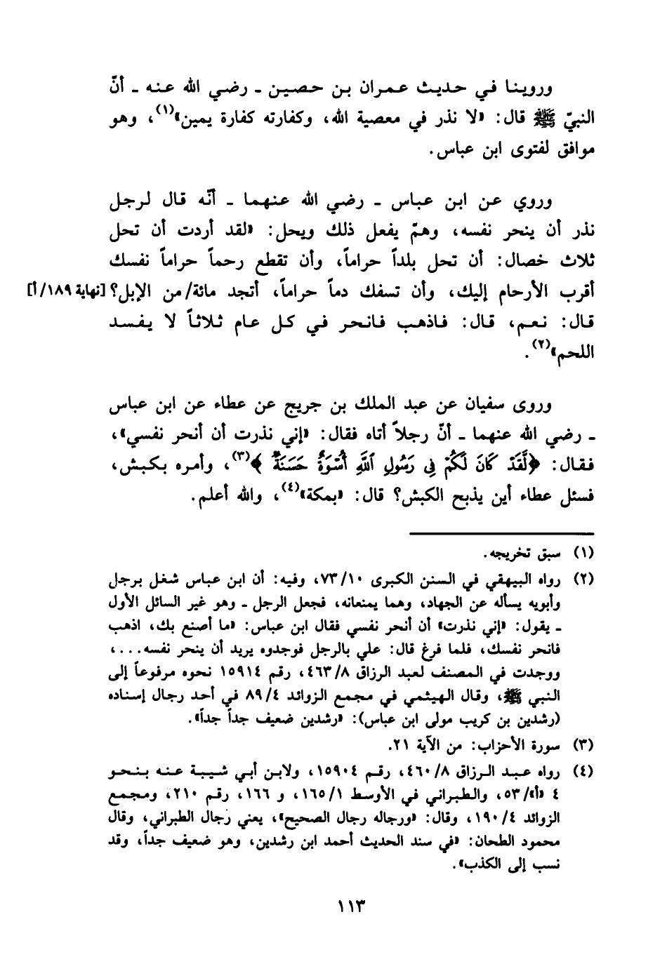 وَرُوِيَ عَن ابْن عَبَّاس - رَضِي الله عَنْهُمَا - أنّه قَالَ لرجل نذر أَن ينْحَر نَفسه، وهمّ يفعل ذَلِك وَيحل: " لقد أردْت أَن تحل ثَلَاث خِصَال: أَن تحل بَلَدا حَرَامًا، وَأَن تقطع رحما حَرَامًا نَفسك أقرب الْأَرْحَام إِلَيْك، وَأَن تسفك دَمًا حَرَامًا، أتجد مائَة من الْإِبِل؟ قَالَ: نعم، قَالَ: فَاذْهَبْ فانحر فِي كل عَام ثَلَاثًا لَا يفْسد اللَّحْم ".