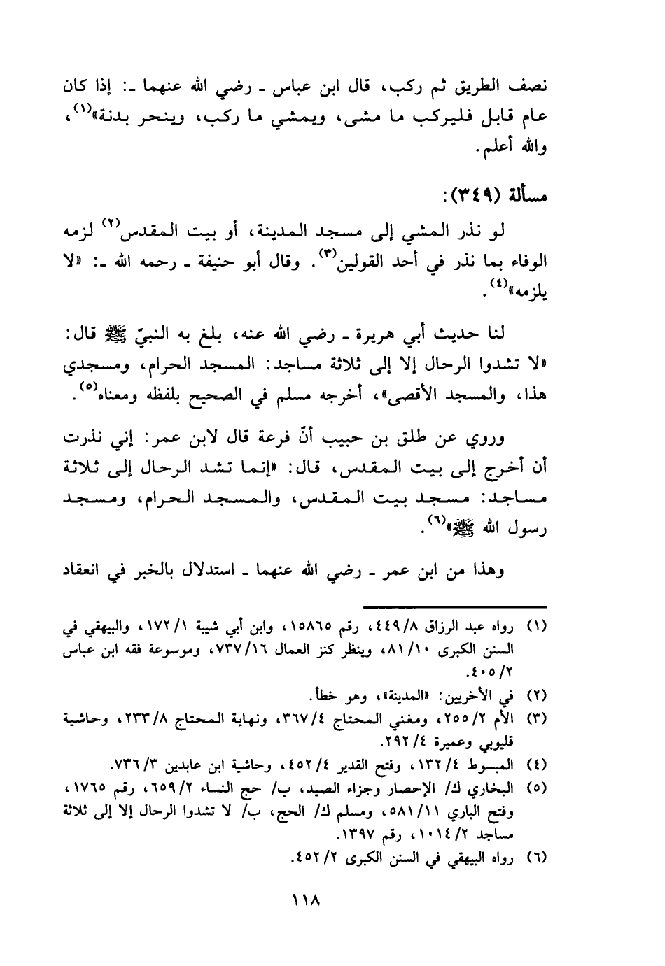 وَرُوِيَ عَن طلق بن حبيب أنّ فرعة قَالَ لِابْنِ عمر: إِنِّي نذرت أَن أخرج إِلَى بَيت الْمُقَدّس، قَالَ: " إِنَّمَا تشد الرّحال إِلَى ثَلَاثَة مَسَاجِد: مَسْجِد بَيت الْمُقَدّس، وَالْمَسْجِد الْحَرَام، وَمَسْجِد رَسُول الله - صَلَّى اللَّهُ عَلَيْهِ وَسَلَّم َ -.