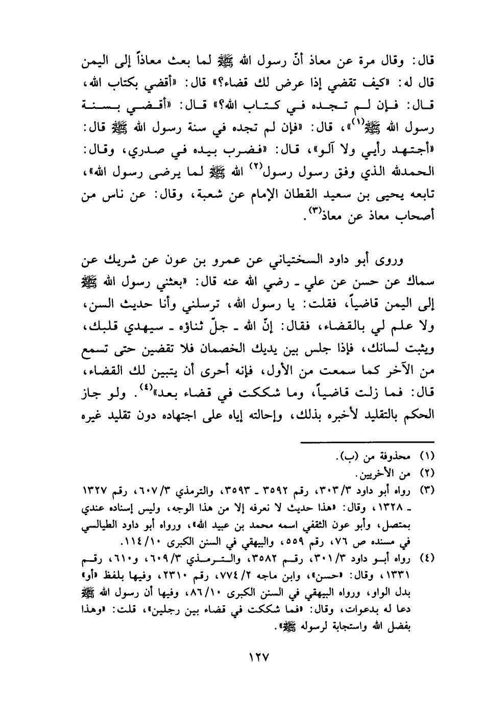 قَالَ: وَقَالَ مرّة عَن معَاذ أنّ رَسُول الله - صَلَّى اللَّهُ عَلَيْهِ وَسَلَّم َ - لما بعث معَاذًا إِلَى الْيمن قَالَ لَهُ: " كَيفَ تقضي إِذا عرض لَك قَضَاء؟ " قَالَ: " أَقْْضِي بِكِتَاب الله، قَالَ: فَإِن لم تَجدهُ فِي كتاب الله؟ " قَالَ: " أَقْْضِي بِسنة رَسُول الله - صَلَّى اللَّهُ عَلَيْهِ وَسَلَّم َ - "، قَالَ: " فَإِن لم تَجدهُ فِي سنة رَسُول الله - صَلَّى اللَّهُ عَلَيْهِ وَسَلَّم َ - قَالَ: " أجتهد رَأْيِي وَلَا آلو "، قَالَ: " فَضرب بِيَدِهِ فِي صَدْرِي، وَقَالَ: الْحَمد لله الَّذِي وفْق رَسُول رَسُول الله - صَلَّى اللَّهُ عَلَيْهِ وَسَلَّم َ - لما يرضى رَسُول الله "، تَابعه يحيى بن سعيد الْقطَّان الإِمَام عَن شُعْبَة، وَقَالَ: عَن نَاس من أَصْحَاب معَاذ عَن معَاذ.
