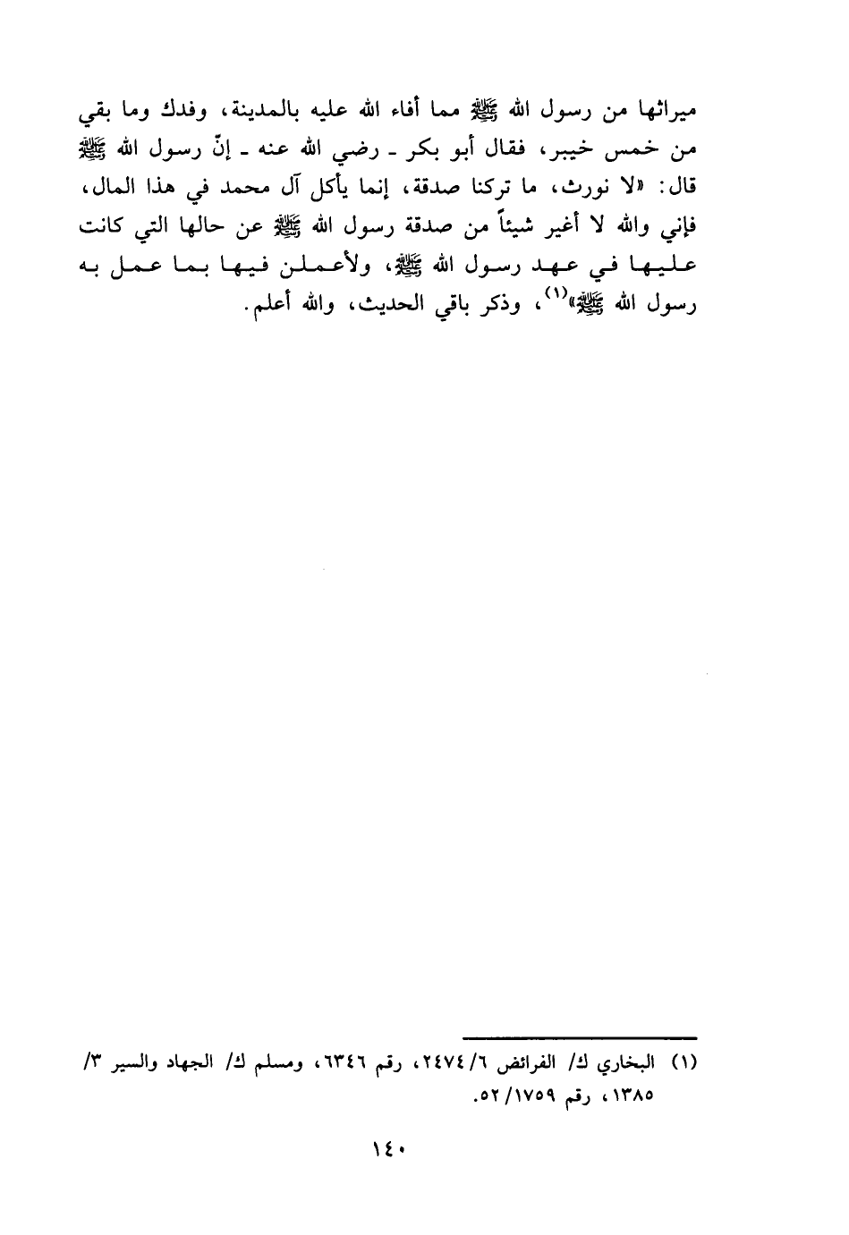 مِيرَاثهَا من رَسُول الله - صَلَّى اللَّهُ عَلَيْهِ وَسَلَّم َ - مِمَّا أَفَاء الله عَلَيْهِ بِالْمَدِينَةِ، وفدك وَمَا بَقِي من خمس خَيْبَر، فَقَالَ أَبُو بكر - رَضِي الله عَنهُ - إنّ رَسُول الله - صَلَّى اللَّهُ عَلَيْهِ وَسَلَّم َ - قَالَ: " لَا نورث، مَا تركنَا صَدَقَة، إِنَّمَا يَأْكُل آل مُحَمَّد فِي هَذَا المَال، فَإِنِّي وَالله لَا أغير شَيْئا من صَدَقَة رَسُول الله - صَلَّى اللَّهُ عَلَيْهِ وَسَلَّم َ - عَن حَالهَا الَّتِي كَانَت عَلَيْهَا فِي عهد رَسُول الله - صَلَّى اللَّهُ عَلَيْهِ وَسَلَّم َ -، ولأعملن فِيهَا بِمَا عمل بِهِ رَسُول الله - صَلَّى اللَّهُ عَلَيْهِ وَسَلَّم َ - "، وَذكر بَاقِي الحَدِيث، وَالله أعلم.