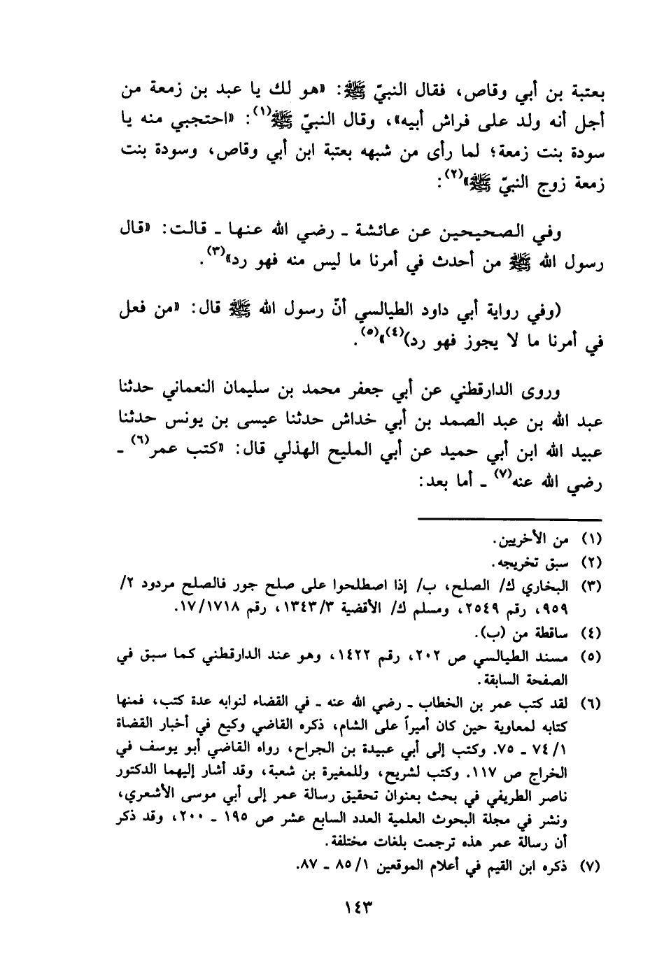 بِعتبَة بن أبي وَقاص، فَقَالَ النبيّ - صَلَّى اللَّهُ عَلَيْهِ وَسَلَّم َ -: " هُوَ لَك يَا عبد بن زَمعَة من أجل أَنه ولد على فرَاش أَبِيه "، وَقَالَ النبيّ - صَلَّى اللَّهُ عَلَيْهِ وَسَلَّم َ -: " احتجبي مِنْهُ يَا سَوْدَة بنت زَمعَة؛ لما رأى من شبهه بِعتبَة ابْن أبي وَقاص، وَسَوْدَة بنت زَمعَة زوج النبيّ - صَلَّى اللَّهُ عَلَيْهِ وَسَلَّم َ -: