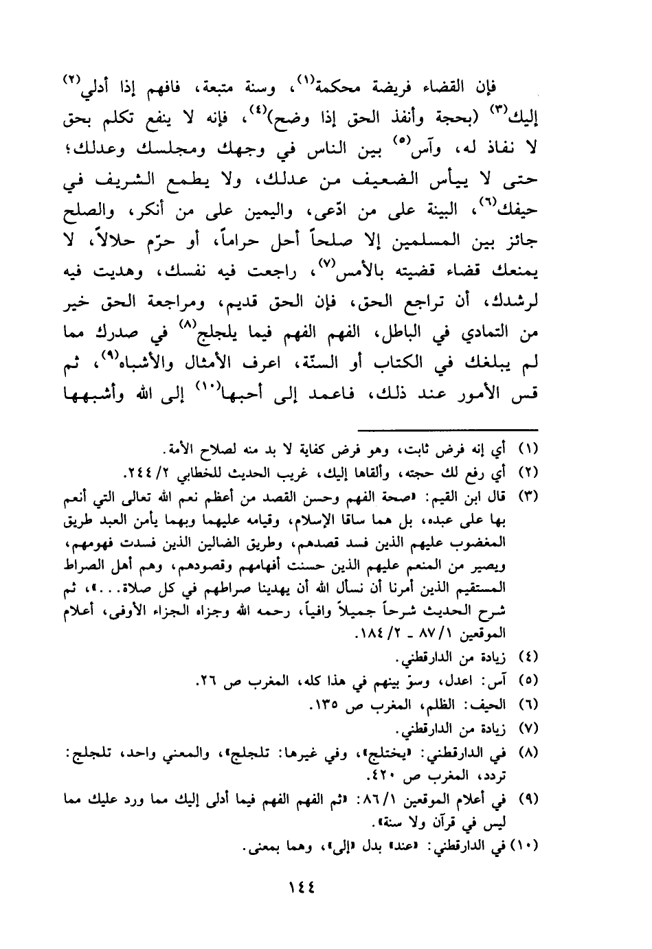 فَإِن الْقَضَاء فَرِيضَة محكمَة، وَسنة متبعة، فَافْهَم إِذا أدلي إِلَيْك (بِحجَّة وأنفذ الْحق إِذا وضح) ، فَإِنَّهُ لَا ينفع تكلم بِحَق لَا نَفاذ لَهُ، وآس بَين النَّاس فِي وَجهك ومجلسك وعدلك؛ حَتَّى لَا ييأس الضَّعِيف من عدلك، وَلَا يطْمع الشريف فِي حيفك، الْبَيِّنَة على من ادّعى، وَالْيَمِين على من أنكر، وَالصُّلْح جَائِز بَين الْمُسلمين إِلَّا صلحا من أحل حَرَامًا، أَو حرّم حَلَالا، لَا يمنعك قَضَاء قَضيته بالْأَمْس، راجعت فِيهِ نَفسك، وهديت فِيهِ لرشدك، أَن تراجع الْحق، فَإِن الْحق قديم، ومراجعة الْحق خير من التَّمَادِي فِي الْبَاطِل، الْفَهم الْفَهم فِيمَا يلجلج فِي صدرك مِمَّا لم يبلغك فِي الْكتاب أَو السنّة، اعرف الْأَمْثَال والأشباه، ثمَّ قس الْأُمُور عِنْد ذَلِك، فاعمد إِلَى أحبها إِلَى الله وأشبهها