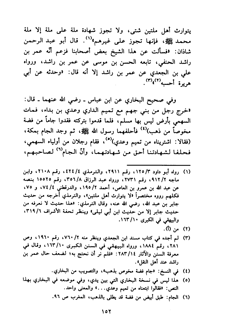 يتوارث أهل ملتين شَتَّى، وَلَا تجوز شَهَادَة مِلَّة على مِلَّة إِلَّا مِلَّة مُحَمَّد - صَلَّى اللَّهُ عَلَيْهِ وَسَلَّم َ -، فَإِنَّهَا تجوز على غَيرهم ". قَالَ أَبُو عبد الرَّحْمَن شَاذان: " فَسَأَلت عَن هَذَا الشَّيْخ بعد أَصْحَابنَا فَزعم أنّه عمر بن رَاشد الْحَنَفِيّ، تَابعه الْحسن بن مُوسَى عَن عمر بن رَاشد، وَرَوَاهُ عَليّ بن الْجَعْدِي عَن عمر بن رَاشد إِلَّا أَنه قَالَ: " وحدثه عَن أبي هُرَيْرَة أَحْسبهُ ".
