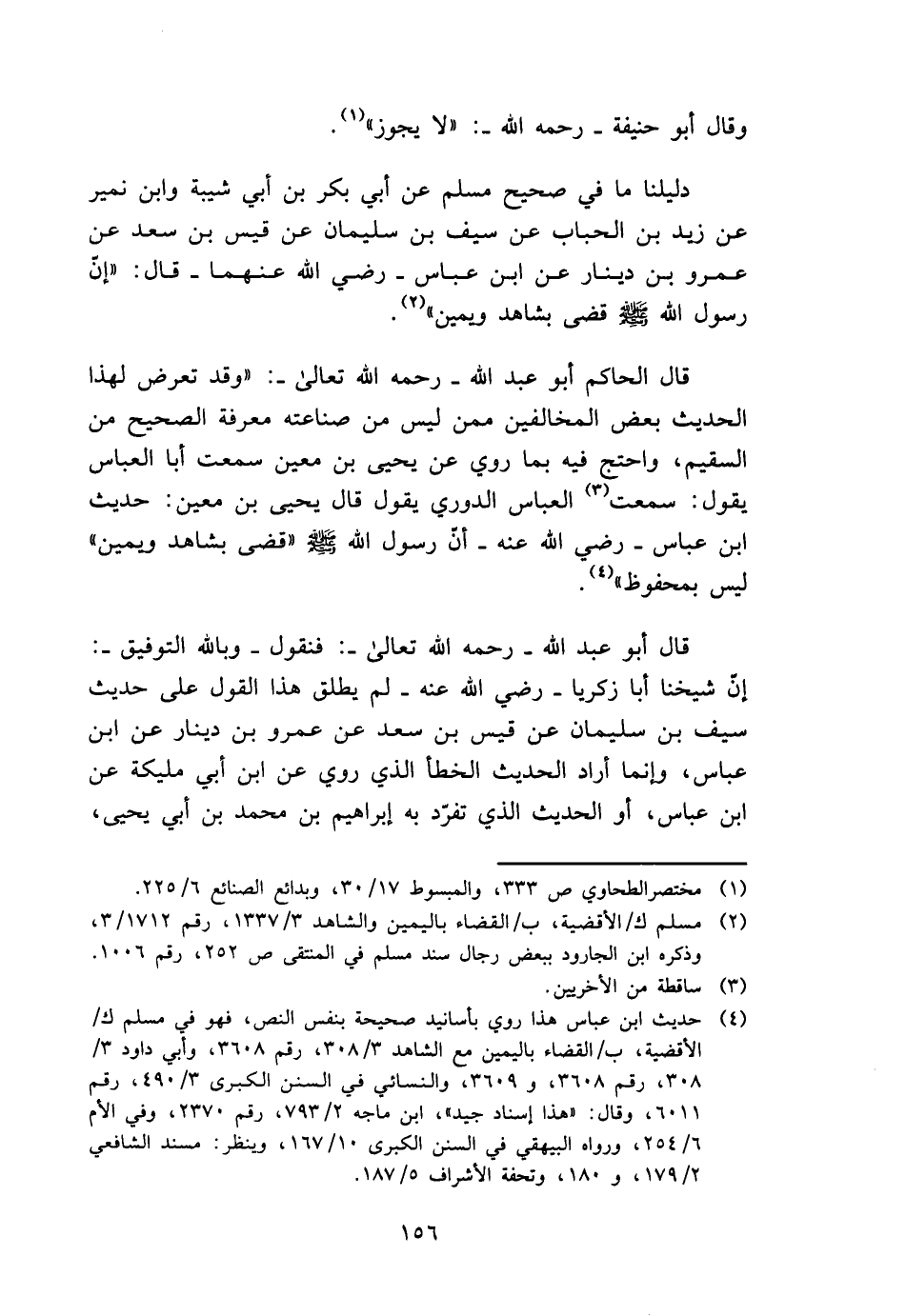 قَالَ الْحَاكِم أَبُو عبد الله - رَحمَه الله تَعَالَى -: " وَقد تعرض لهَذَا الحَدِيث بعض الْمُخَالفين مِمَّن لَيْسَ من صناعته معرفَة الصَّحِيح من السقيم، وَاحْتج فِيهِ بِمَا رُوِيَ عَن يحيى بن معِين سَمِعت أَبَا الْعَبَّاس يَقُول: سَمِعت الْعَبَّاس الدوري يَقُول قَالَ يحيى بن معِين: حَدِيث ابْن عَبَّاس - رَضِي الله عَنهُ - أنّ رَسُول الله - صَلَّى اللَّهُ عَلَيْهِ وَسَلَّم َ - " قضى بِشَاهِد وَيَمِين " لَيْسَ بِمَحْفُوظ ".