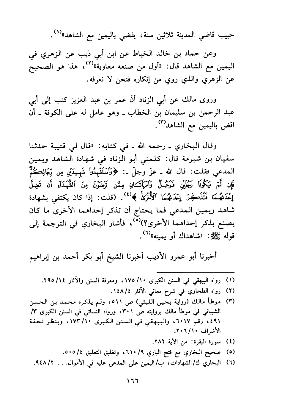 وَقَالَ البُخَارِيّ - رَحمَه الله - فِي كِتَابه: " قَالَ لي قُتَيْبَة حَدثنَا سُفْيَان بن شبْرمَة قَالَ: كلمني أَبُو الزِّنَاد فِي شَهَادَة الشَّاهِد وَيَمِين الْمُدَّعِي فَقلت: قَالَ الله - عزّ وجلّ -: {وَاسْتَشْهِدُواْ شَهِيدَيْنِ مِّن رِّجَالِكُمْ فَإِن لَّمْ يَكُونَا رَجُلَيْنِ فَرَجُلٌ وَامْرَأَتَانِ مِمَّن تَرْضَوْنَ مِنَ الشُّهَدَاءِ أَن تَضِلَّ إْحْدَاهُمَا فَتُذَكِّرَ إِحْدَاهُمَا الأُخْرَى} . (قلت: إِذا كَانَ يَكْتَفِي بِشَهَادَة شَاهد وَيَمِين الْمُدَّعِي فَمَا يحْتَاج أَن تذكر إِحْدَاهمَا الْأُخْرَى مَا كَانَ يصنع بِذكر إِحْدَاهمَا الْأُخْرَى؟) ، فَأَشَارَ البُخَارِيّ فِي التَّرْجَمَة إِلَى قَوْله - صَلَّى اللَّهُ عَلَيْهِ وَسَلَّم َ -: " شَاهِدَاك أَو يَمِينه ".