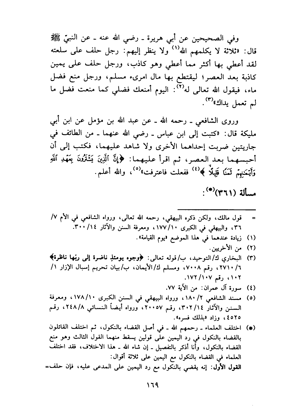 وَفِي الصَّحِيحَيْنِ عَن أبي هُرَيْرَة - رَضِي الله عَنهُ - عَن النبيّ - صَلَّى اللَّهُ عَلَيْهِ وَسَلَّم َ - قَالَ: " ثَلَاثَة لَا يكلمهم الله وَلَا ينظر إِلَيْهِم: رجل حلف على سلْعَته لقد أعطي بهَا أَكثر مِمَّا أعطي وَهُوَ كَاذِب، وَرجل حلف على يَمِين كَاذِبَة بعد الْعَصْر؛ ليقتطع بهَا مَال امْرِئ مُسلم، وَرجل منع فضل مَاء، فَيَقُول الله تَعَالَى لَهُ: الْيَوْم أمنعك فضلي كَمَا منعت فضل مَا لم تعْمل يداك ".