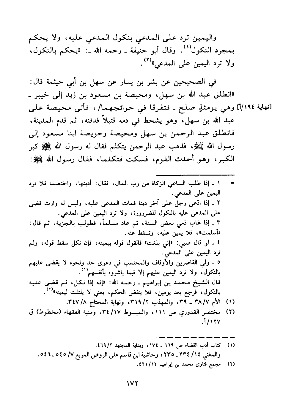 وَالْيَمِين ترد على الْمُدَّعِي بنكول الْمُدَّعِي عَلَيْهِ، وَلَا يحكم بِمُجَرَّد النّكُول. وَقَالَ أَبُو حنيفَة - رَحمَه الله -: " يحكم بِالنّكُولِ "، وَلَا ترد الْيَمين على الْمُدَّعِي ".