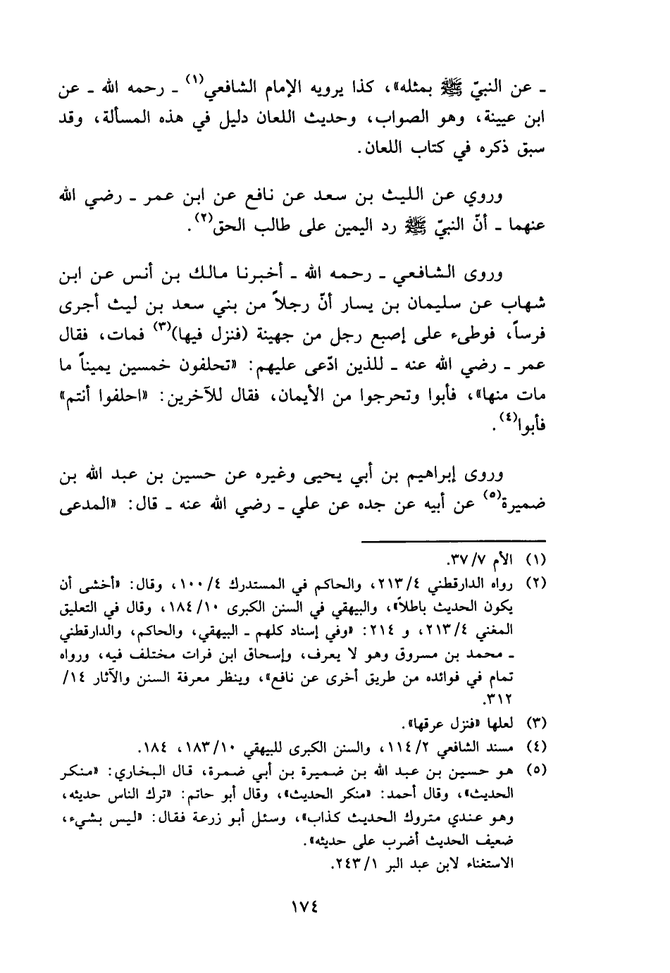- عَن النبيّ - صَلَّى اللَّهُ عَلَيْهِ وَسَلَّم َ - بِمثلِهِ "، كَذَا يرويهِ الإِمَام الشَّافِعِي - رَحمَه الله - عَن ابْن عُيَيْنَة، وَهُوَ الصَّوَاب، وَحَدِيث اللّعان دَلِيل فِي هَذِه الْمَسْأَلَة، وَقد سبق ذكره فِي كتاب اللّعان.