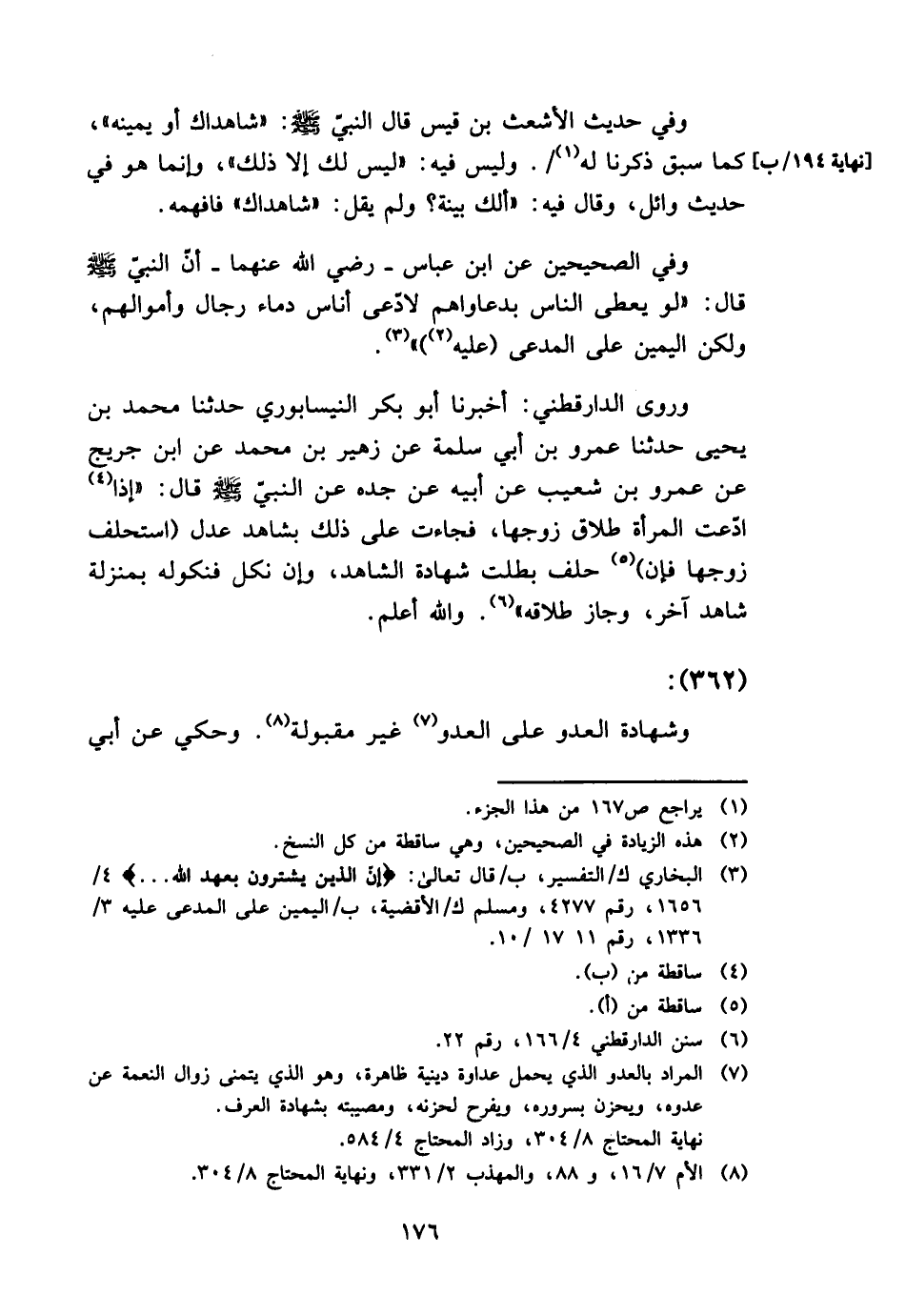 وَفِي حَدِيث الْأَشْعَث بن قيس قَالَ النبيّ - صَلَّى اللَّهُ عَلَيْهِ وَسَلَّم َ -: " شَاهِدَاك أَو يَمِينه "، كَمَا سبق ذكرنَا لَهُ. وَلَيْسَ فِيهِ: " لَيْسَ لَك إِلَّا ذَلِك "، وَإِنَّمَا هُوَ فِي حَدِيث وَائِل، وَقَالَ فِيهِ: " أَلَك بَيِّنَة؟ وَلم يقل: " شَاهِدَاك " فافهمه.