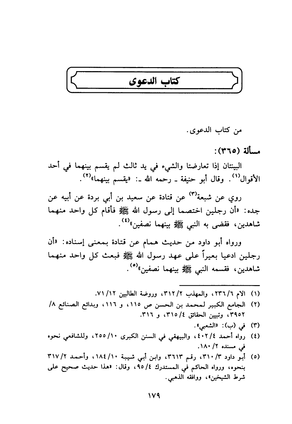وَرَوَاهُ أَبُو دَاوُد من حَدِيث همام عَن قَتَادَة بِمَعْنى إِسْنَاده: " أَن رجلَيْنِ ادّعَيَا بَعِيرًا على عهد رَسُول الله - صَلَّى اللَّهُ عَلَيْهِ وَسَلَّم َ - فَبعث كل وَاحِد مِنْهُمَا شَاهِدين، فَقَسمهُ النَّبِي - صَلَّى اللَّهُ عَلَيْهِ وَسَلَّم َ - بَينهمَا نِصْفَيْنِ ".