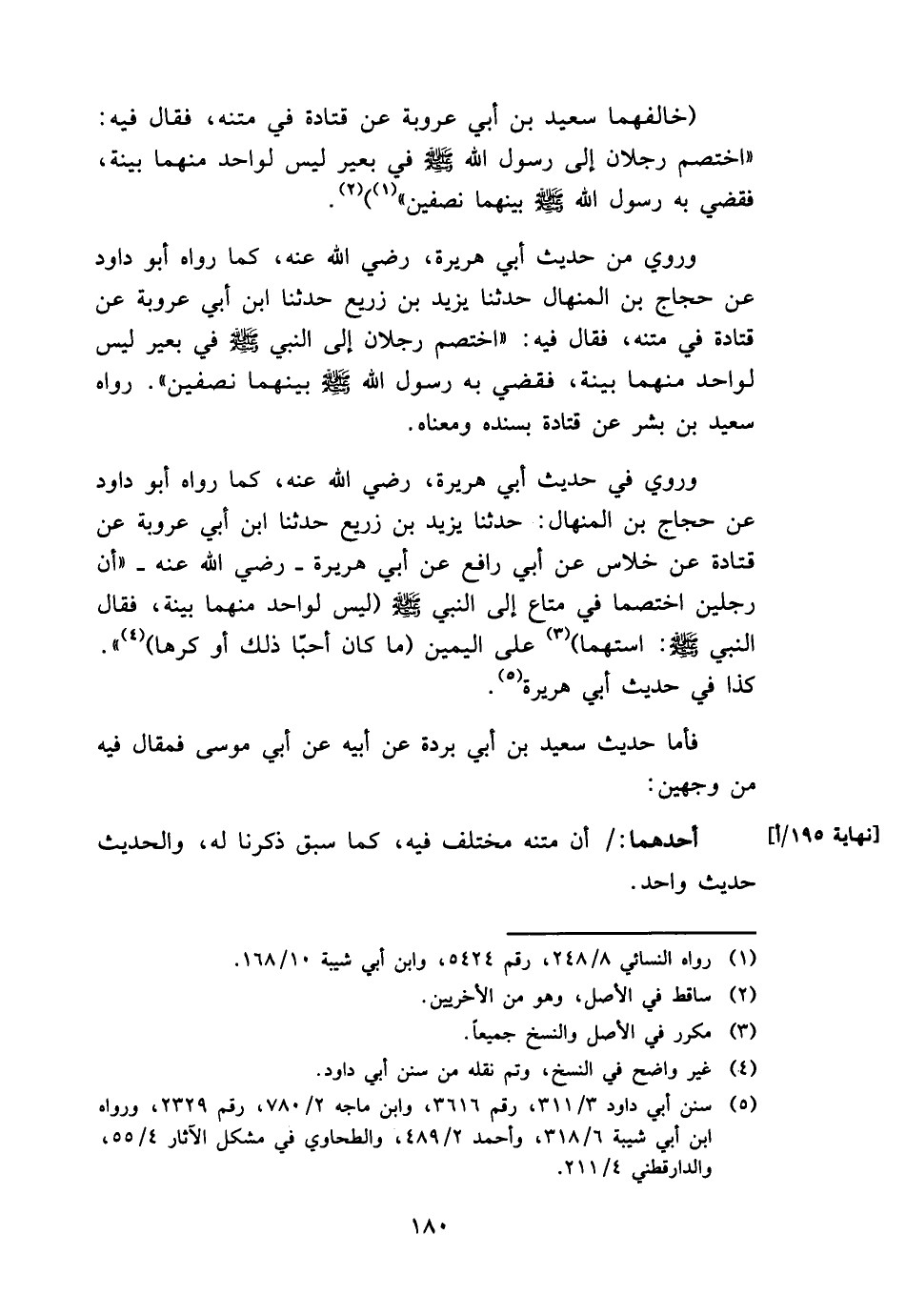 (خالفهما سعيد بن أبي عرُوبَة عَن قَتَادَة فِي مَتنه، فَقَالَ فِيهِ: " اخْتصم رجلَانِ إِلَى رَسُول الله - صَلَّى اللَّهُ عَلَيْهِ وَسَلَّم َ - فِي بعير لَيْسَ لوَاحِد مِنْهُمَا بَيِّنَة، فقضي بِهِ رَسُول الله - صَلَّى اللَّهُ عَلَيْهِ وَسَلَّم َ - بَينهمَا نِصْفَيْنِ ".