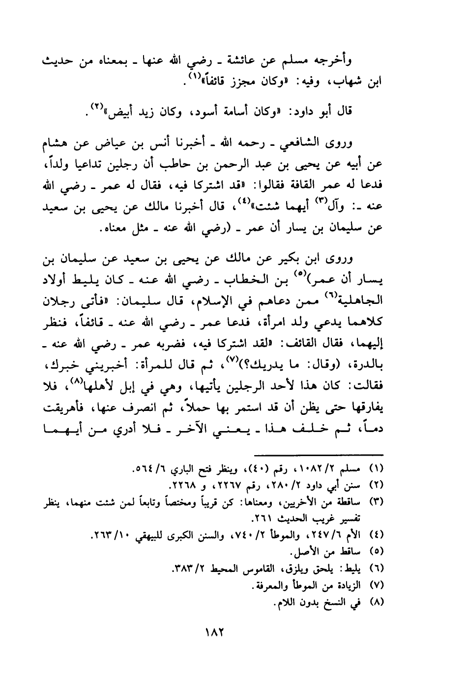 وروى الشَّافِعِي - رَحمَه الله - أخبرنَا أنس بن عِيَاض عَن هِشَام عَن أَبِيه عَن يحيى بن عبد الرَّحْمَن بن حَاطِب أَن رجلَيْنِ تداعيا ولدا، فَدَعَا لَهُ عمر الْقَافة فَقَالُوا: " قد اشْتَركَا فِيهِ، فَقَالَ لَهُ عمر - رَضِي الله عَنهُ -: وَآل أَيهمَا شِئْت "، قَالَ أخبرنَا مَالك عَن يحيى بن سعيد عَن سُلَيْمَان بن يسَار أَن عمر - (رَضِي الله عَنهُ - مثل مَعْنَاهُ.