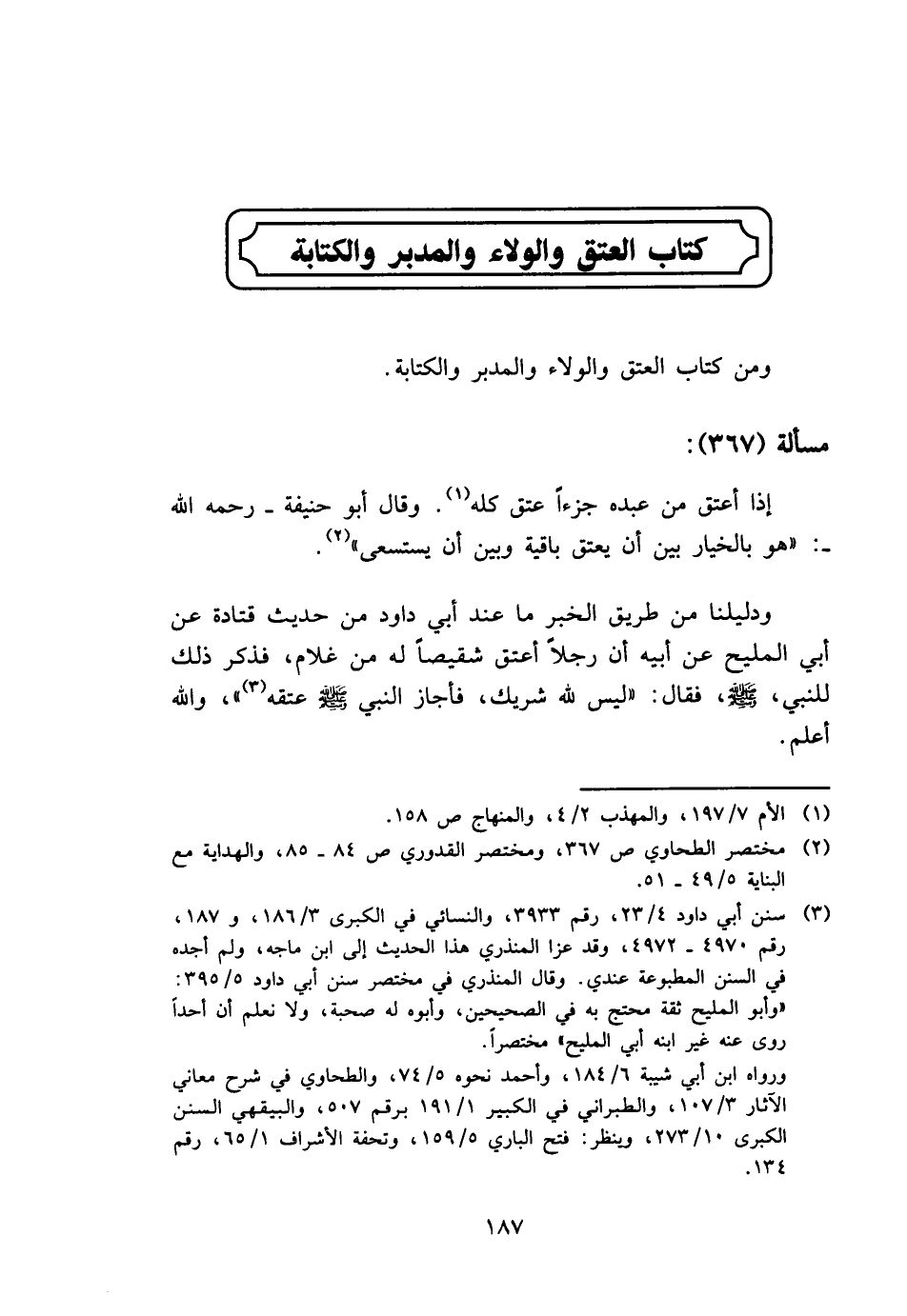 وَدَلِيلنَا من طَرِيق الْخَبَر مَا عِنْد أبي دَاوُد من حَدِيث قَتَادَة عَن أبي الْمليح عَن أَبِيه أَن رجلا أعتق شقيصاً لَهُ من غُلَام، فَذكر ذَلِك للنَّبِي - صَلَّى اللَّهُ عَلَيْهِ وَسَلَّم َ -، فَقَالَ: " لَيْسَ لله شريك، فَأجَاز النَّبِي - صَلَّى اللَّهُ عَلَيْهِ وَسَلَّم َ - عتقه "، وَالله أعلم.