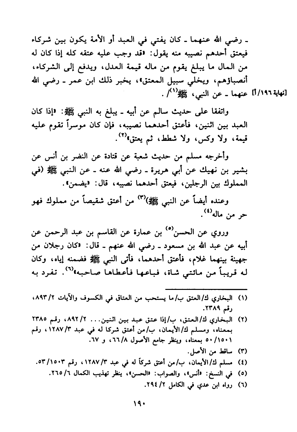 - رَضِي الله عَنْهُمَا - كَانَ يُفْتِي فِي العَبْد أَو الْأمة يكون بَين شُرَكَاء فَيعتق أحدهم نصِيبه مِنْهُ يَقُول: " قد وَجب عَلَيْهِ عتقه كُله إِذا كَانَ لَهُ من المَال مَا يبلغ يقوم من مَاله قيمَة الْعدْل، وَيدْفَع إِلَى الشُّرَكَاء، أنصباؤهم، ويخلي سَبِيل الْمُعْتق "، يخبر ذَلِك ابْن عمر - رَضِي الله عَنْهُمَا - عَن النَّبِي، - صَلَّى اللَّهُ عَلَيْهِ وَسَلَّم َ -.