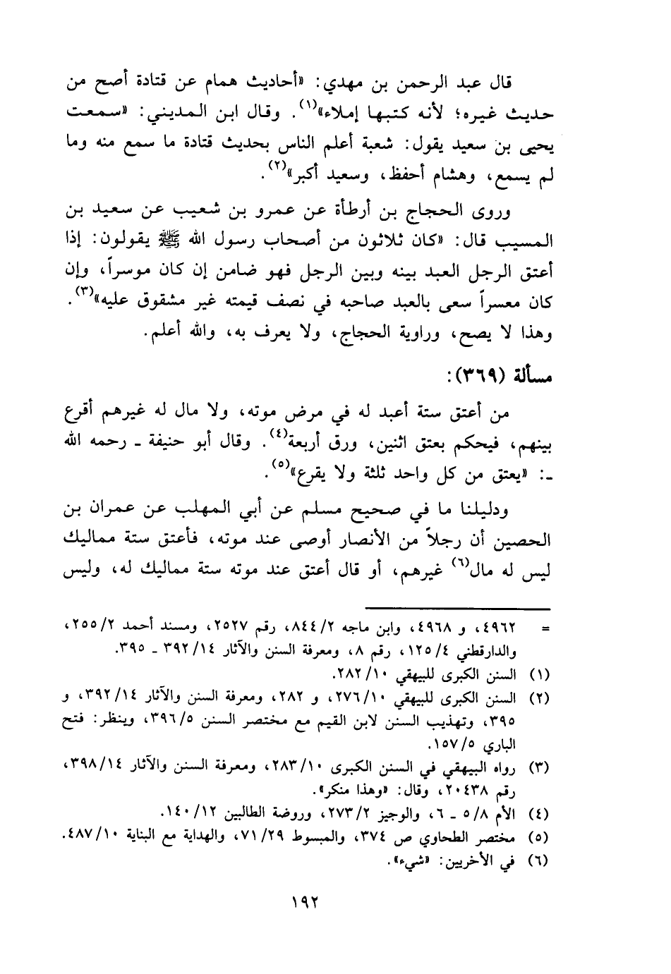 وَدَلِيلنَا مَا فِي صَحِيح مُسلم عَن أبي الْمُهلب عَن عمرَان بن الْحصين أَن رجلا من الْأَنْصَار أوصى عِنْد مَوته، فَأعتق سِتَّة مماليك لَيْسَ لَهُ مَال غَيرهم، أَو قَالَ أعتق عِنْد مَوته سِتَّة مماليك لَهُ، وَلَيْسَ