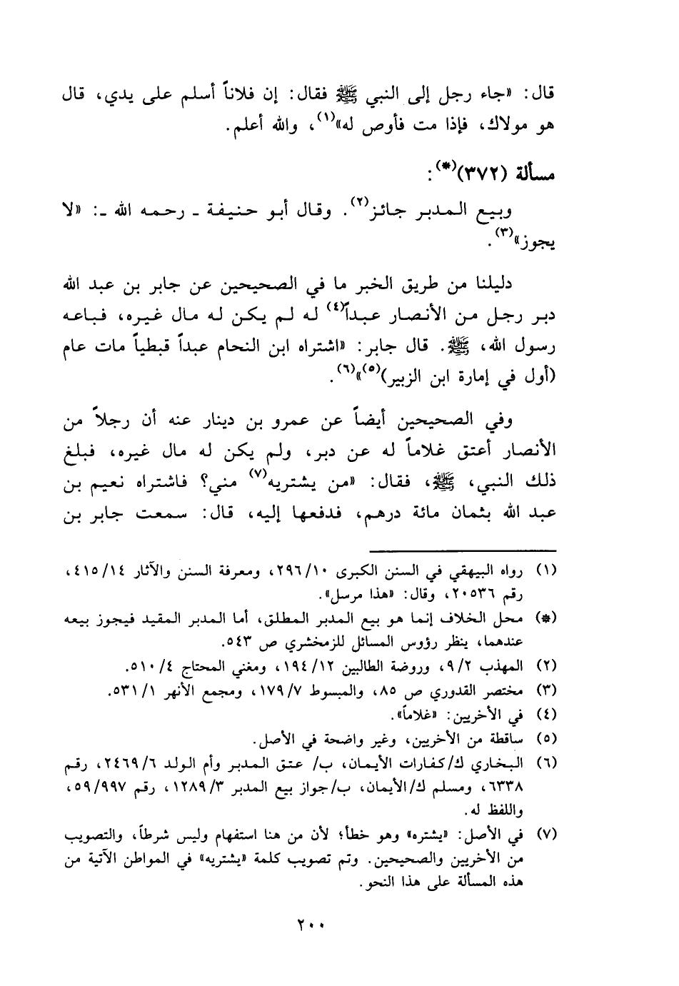 وَفِي الصَّحِيحَيْنِ أَيْضا عَن عَمْرو بن دِينَار عَنهُ أَن رجلا من الْأَنْصَار أعتق غُلَاما لَهُ عَن دبر، وَلم يكن لَهُ مَال غَيره، فَبلغ ذَلِك النَّبِي، - صَلَّى اللَّهُ عَلَيْهِ وَسَلَّم َ -، فَقَالَ: " من يَشْتَرِيهِ مني؟ فَاشْتَرَاهُ نعيم بن عبد الله بثمان مائَة دِرْهَم، فَدَفعهَا إِلَيْهِ، قَالَ: سَمِعت جَابر بن