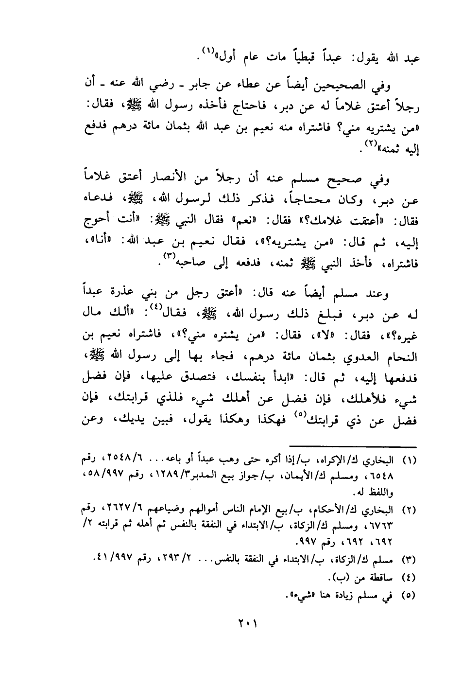 وَفِي صَحِيح مُسلم عَنهُ أَن رجلا من الْأَنْصَار أعتق غُلَاما عَن دبر، وَكَانَ مُحْتَاجا، فَذكر ذَلِك لرَسُول الله، - صَلَّى اللَّهُ عَلَيْهِ وَسَلَّم َ -، فَدَعَاهُ فَقَالَ: " أعتقت غلامك؟ " فَقَالَ: " نعم " فَقَالَ النَّبِي - صَلَّى اللَّهُ عَلَيْهِ وَسَلَّم َ -: " أَنْت أحْوج إِلَيْهِ، ثمَّ قَالَ: " من يَشْتَرِيهِ؟ "، فَقَالَ نعيم بن عبد الله: " أَنا "، فَاشْتَرَاهُ، فَأخذ النَّبِي - صَلَّى اللَّهُ عَلَيْهِ وَسَلَّم َ - ثمنه، فَدفعهُ إِلَى صَاحبه.