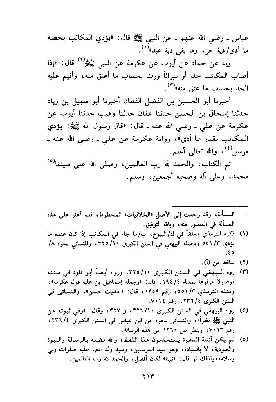 تمّ الْكتاب، وَالْحَمْد لله رب الْعَالمين، وَصلى الله على سيدنَا مُحَمَّد، وعَلى آله وَصَحبه أَجْمَعِينَ، وَسلم.
