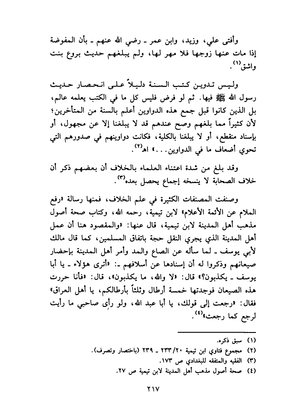 وصنفت المصنفات الْكَثِيرَة فِي علم الْخلاف، فَمِنْهَا رِسَالَة " رفع الملام عَن الْأَئِمَّة الْأَعْلَام " لِابْنِ تَيْمِية، رَحمَه الله، وَكتاب صِحَة أصُول مَذْهَب أهل الْمَدِينَة لِابْنِ تَيْمِية، قَالَ عَنْهَا: " وَالْمَقْصُود هُنَا أَن عمل أهل الْمَدِينَة الَّذِي يجْرِي النَّقْل حجَّة بِاتِّفَاق الْمُسلمين، كَمَا قَالَ مَالك لأبي يُوسُف - لما سَأَلَهُ عَن الصَّاع وَالْمدّ وَأمر أهل الْمَدِينَة بإحضار صيعانهم وَذكروا لَهُ أَن إسنادها عَن أسلافهم -: " أَتَرَى هَؤُلَاءِ - يَا أَبَا يُوسُف - يكذبُون؟ " قَالَ: " لَا وَالله، مَا يكذبُون "، قَالَ: " فَأَنا حررت هَذِه الصيعان فَوَجَدتهَا خَمْسَة أَرْطَال وَثلثا بأرطالكم، يَا أهل الْعرَاق " فَقَالَ: " رجعت إِلَى قَوْلك، يَا أَبَا عبد الله، وَلَو رأى صاحبى مَا رَأَيْت لرجع كَمَا رجعت ".
