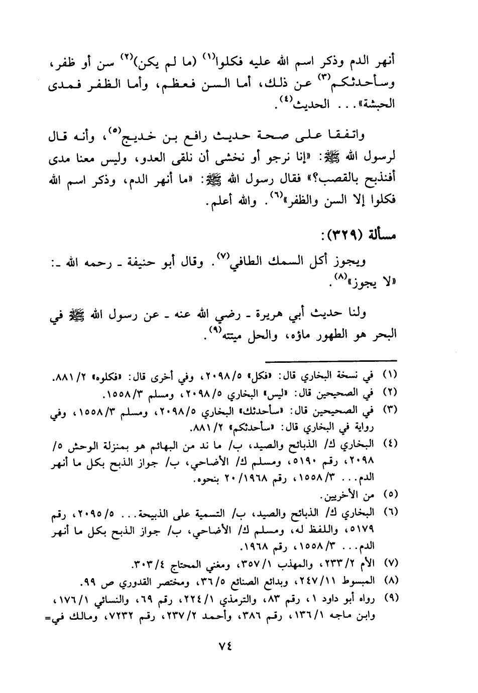 أنهر الدَّم وَذكر اسْم الله عَلَيْهِ فَكُلُوا (مَا لم يكن) سنّ أَو ظفر، وَسَأُحَدِّثُكُمْ عَن ذَلِك، أما السن فَعظم، وَأما الظفر فمدى الْحَبَشَة " ... الحَدِيث.