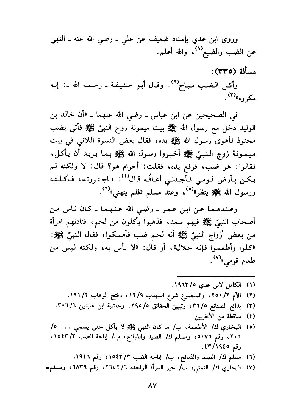 وَأكل الضَّب مُبَاح. وَقَالَ أَبُو حنيفَة - رَحمَه الله -: إِنَّه مَكْرُوه ".