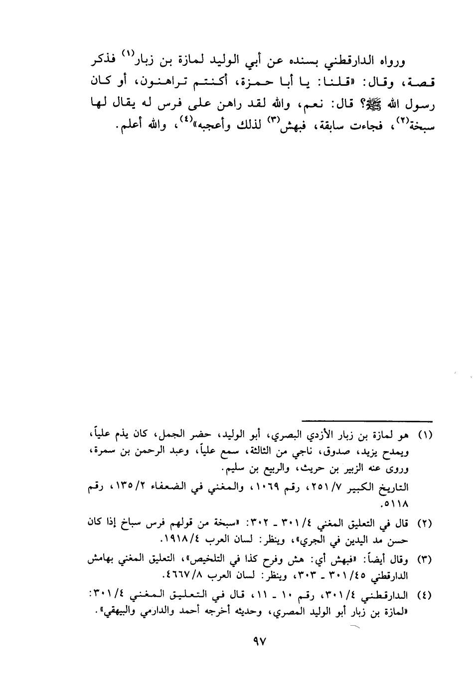 وَرَوَاهُ الدَّارَقُطْنِيّ بِسَنَدِهِ عَن أبي الْوَلِيد لمازة بن زبار فَذكر قصَّة، وَقَالَ: " قُلْنَا: يَا أَبَا حَمْزَة، أَكُنْتُم تراهنون، أَو كَانَ رَسُول الله - صَلَّى اللَّهُ عَلَيْهِ وَسَلَّم َ -؟ قَالَ: نعم، وَالله لقد رَاهن على فرس لَهُ يُقَال لَهَا سبخَة، فَجَاءَت سَابِقَة، فبهش لذَلِك وَأَعْجَبهُ "، وَالله أعلم.