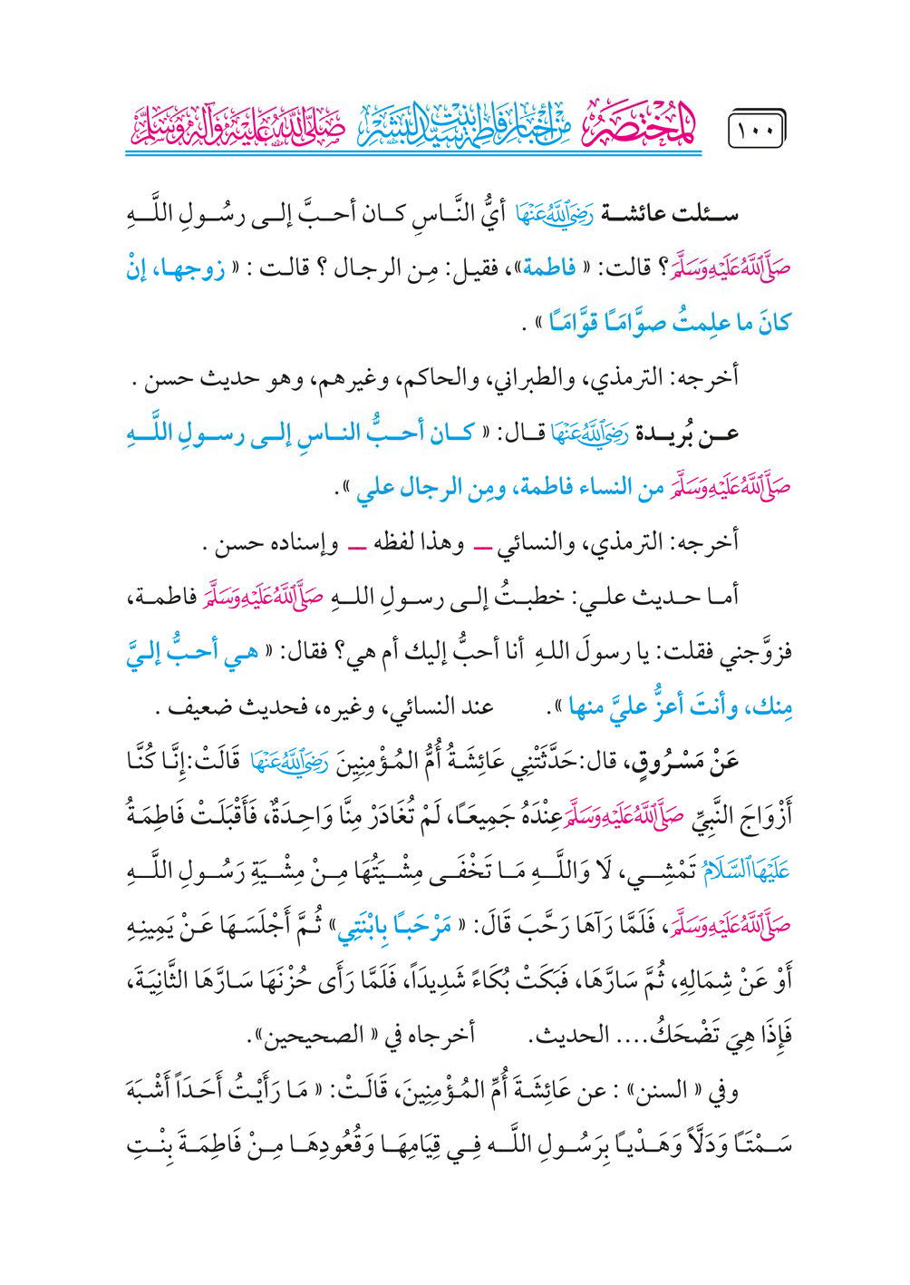 سئلت عائشة - رضي الله عنها - أيُّ النَّاسِ كان أحبَّ إلى رسُولِ اللَّهِ - صلى الله عليه وسلم -؟ قالت: «فاطمة»، فقيل: مِن الرجال؟ قالت: «زوجها، إنْ كانَ ما علِمتُ صوَّامَاً قوَّامَاً».