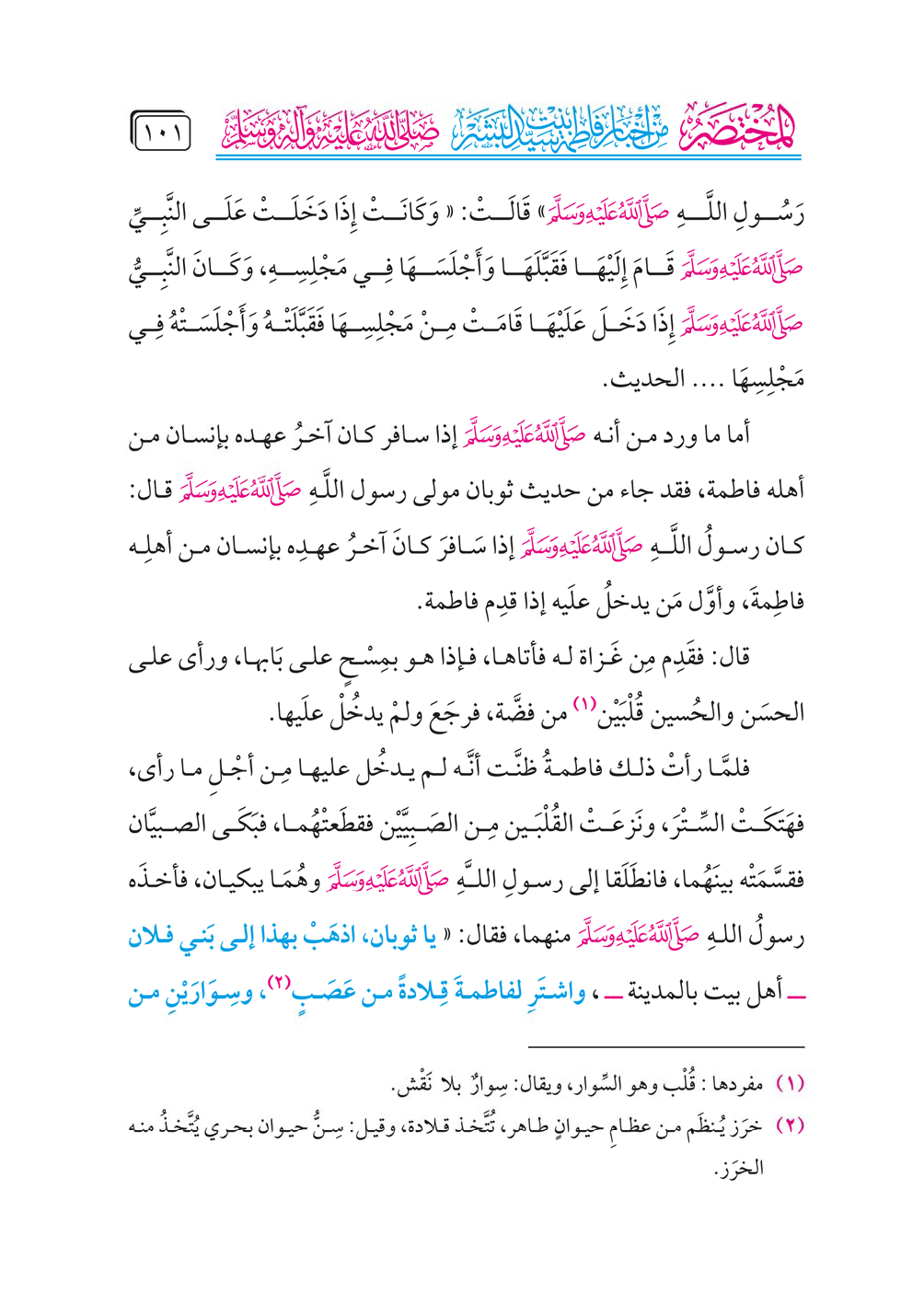 فلمَّا رأتْ ذلك فاطمةُ ظنَّت أنَّه لم يدخُل عليها مِن أجْلِ ما رأى، فهَتَكَتْ السِّتْرَ، ونَزعَتْ القُلْبَين مِن الصَبِيَّيْن فقطَعتْهُما، فبَكَى الصبيَّان فقسَّمَتْه بينَهُما، فانطَلَقا إلى رسولِ اللَّهِ - صلى الله عليه وسلم - وهُمَا يبكيان، فأخذَه رسولُ اللهِ - صلى الله عليه وسلم - منهما، فقال: «يا ثوبان، اذهَبْ بهذا إلى بَني فلان ــ أهل بيت بالمدينة ــ، واشتَرِ لفاطمةَ قِلادةً من عَصَبٍ (¬٢)، وسِوَارَيْنِ من