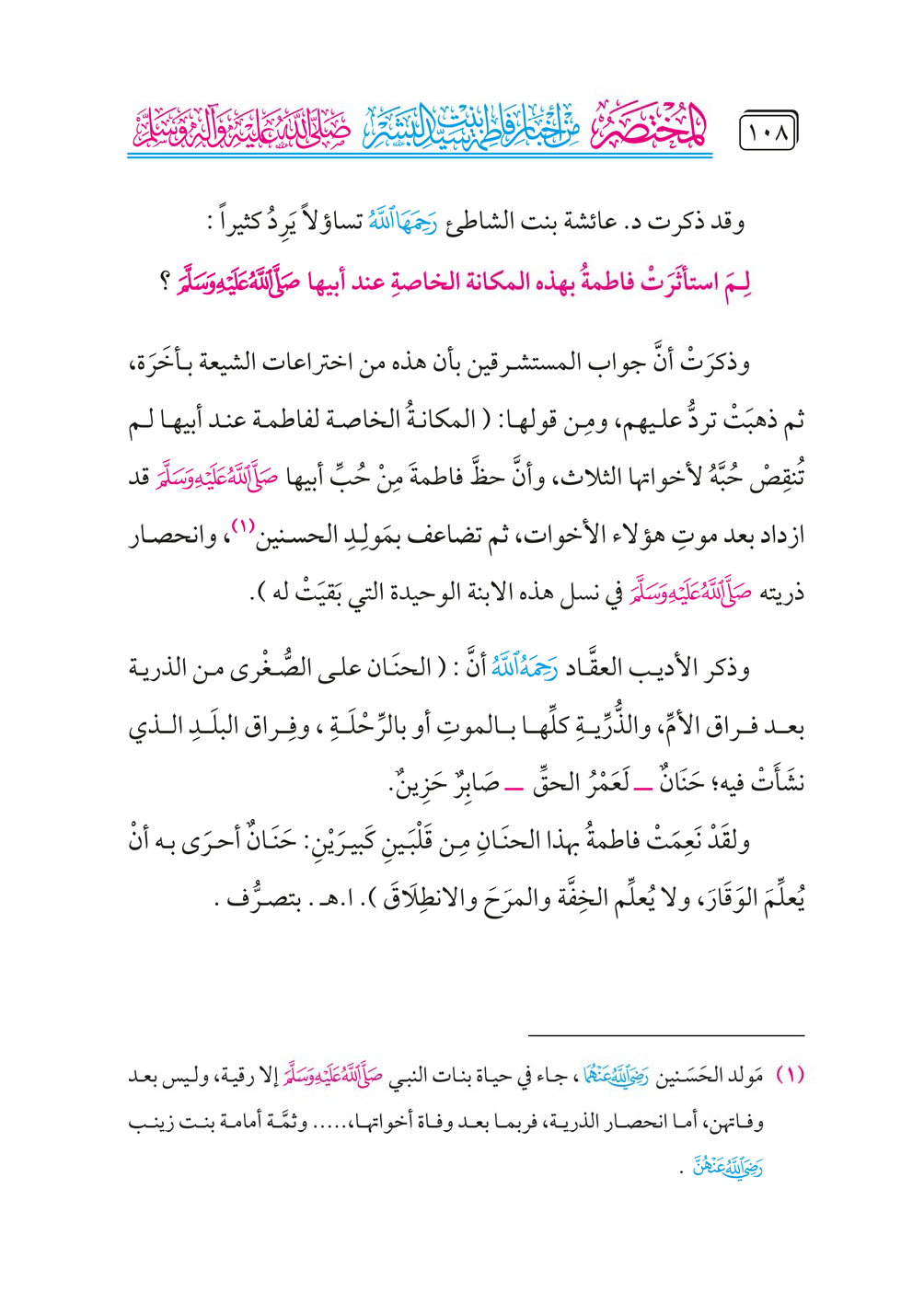 (¬١) مَولد الحَسَنين - رضي الله عنهما -، جاء في حياة بنات النبي - صلى الله عليه وسلم - إلا رقية، وليس بعد وفاتهن، أما انحصار الذرية، فربما بعد وفاة أخواتها، .. وثمَّة أمامة بنت زينب - رضي الله عنهن -.