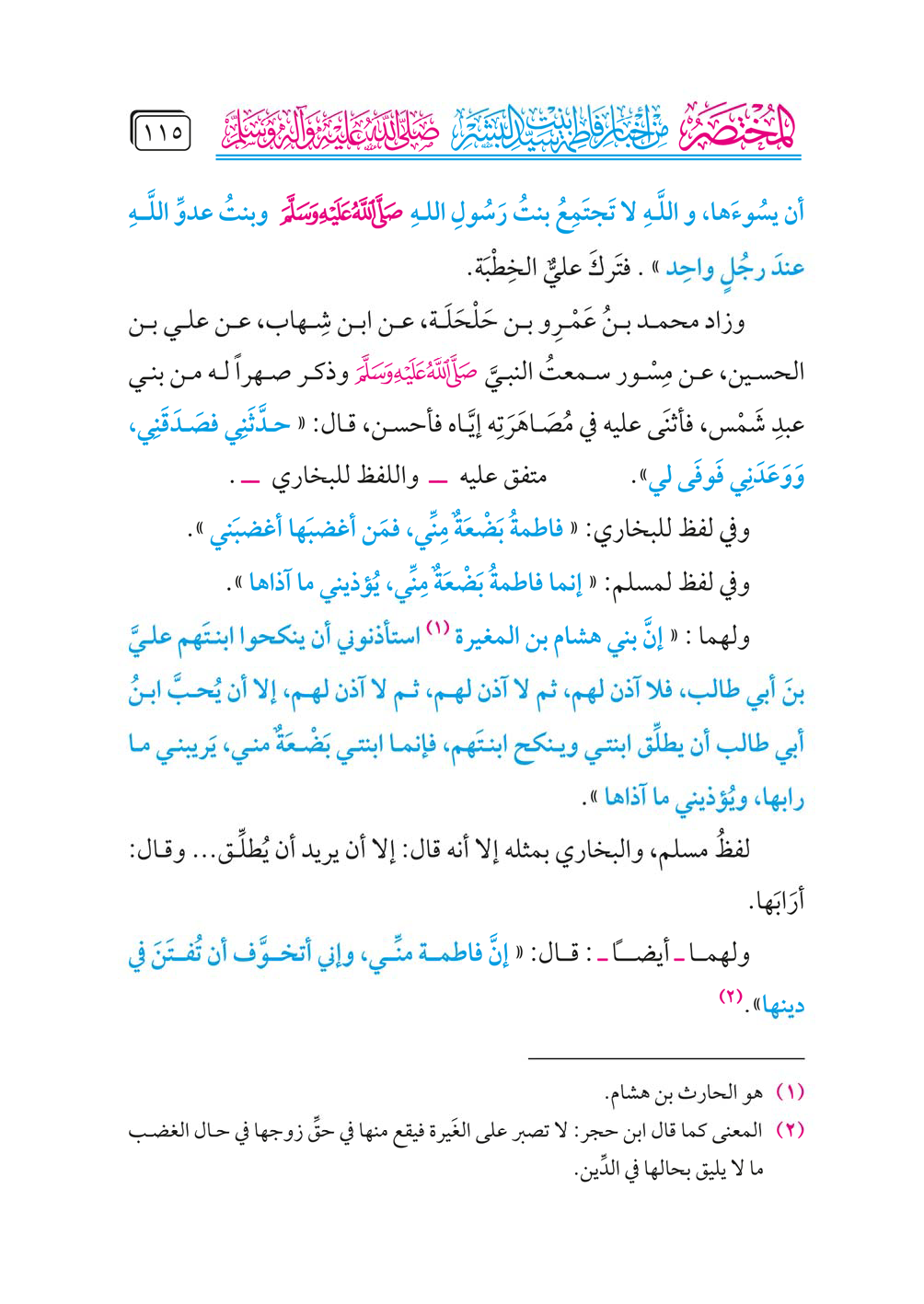 وفي لفظ لمسلم: «إنما فاطمةُ بَضْعَةٌ مِنِّي، يُؤذيني ما آذاها».