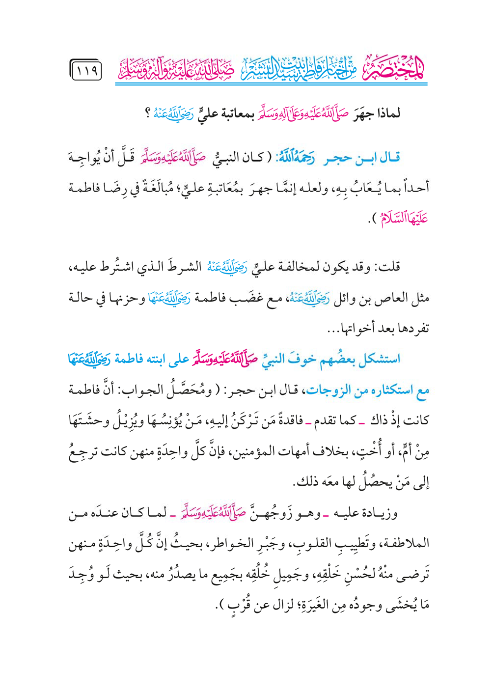 قال ابن حجر - رحمه الله -: (كان النبيُّ - صلى الله عليه وسلم - قَلَّ أنْ يُواجِهَ أحداً بما يُعَابُ بِهِ، ولعله إنمَّا جهرَ بمُعَاتبةِ عليٍّ؛ مُبالَغَةً في رِضَا فاطمة - عليها السلام -).