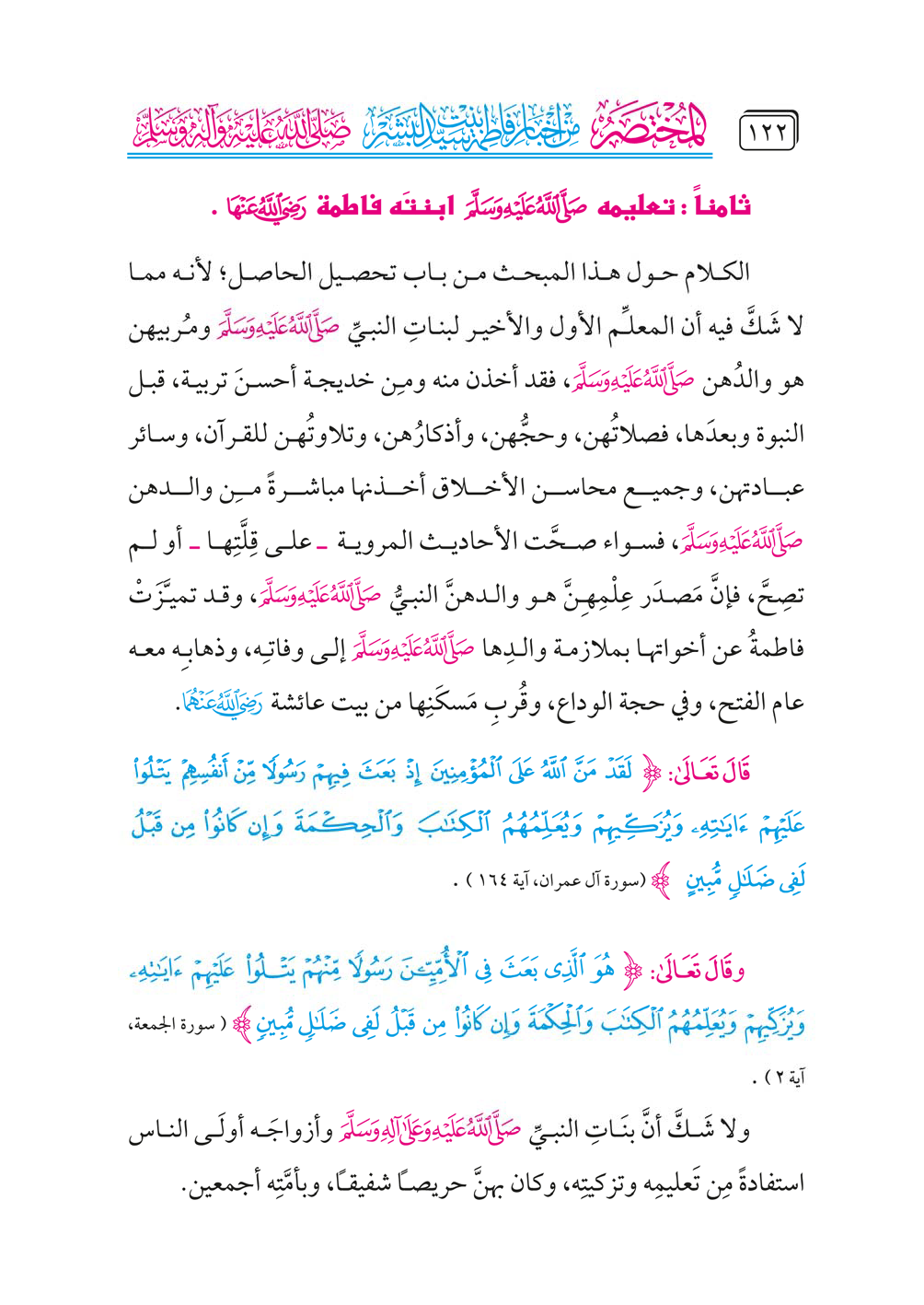 ولا شَكَّ أنَّ بنَاتِ النبيِّ - صلى الله عليه وعلى آله وسلم - وأزواجَه أولَى الناس استفادةً مِن تَعليمِه وتزكيتِه، وكان بهنَّ حريصاً شفيقاً، وبأمَّتِه أجمعين.