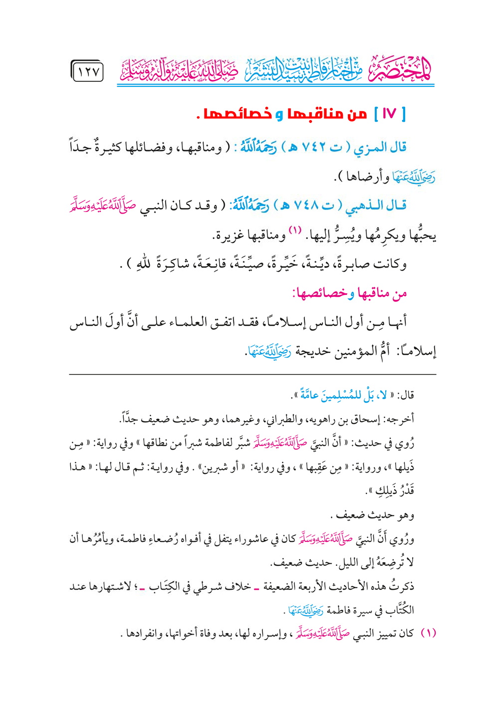 قال الذهبي (ت ٧٤٨ هـ) - رحمه الله -: (وقد كان النبي - صلى الله عليه وسلم - يحبُّها ويكرِمُها ويُسِرُّ إليها. (¬١) ومناقبها غزيرة.