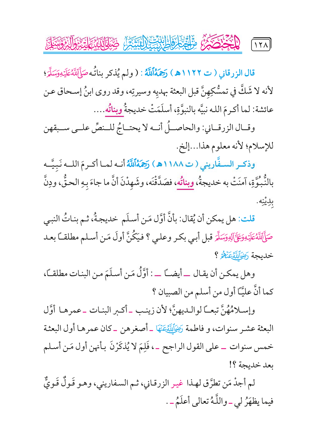 وإسلامُهُنَّ تبعاً لوالديهنَّ؛ لأن زينب ـ أكبر البنات ـ عمرها أوَّل البعثة عشر سنوات، وفاطمة - رضي الله عنها - ـ أصغرهن ـ كان عمرها أول البعثة خمس سنوات ــ على القول الراجح ـ، فَلِمَ لا يُذكَرْنَ بأنهن أول مَن أسلم بعد خديجة؟ !
