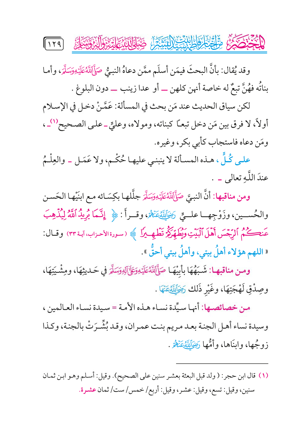 وقد يُقال: بأنَّ البحثَ فيمَن أسلَم ممَّن دعاهُ النبيُّ - صلى الله عليه وسلم -، وأما بناتُه فهُنَّ تبعٌ له خاصة أنهن كلهن ــ أو عدا زينب ــ دون البلوغ.