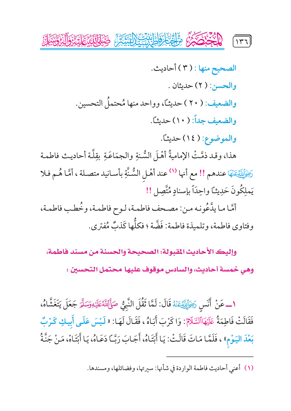 وإليك الأحاديث المقبولة: الصحيحة والحسنة من مسند فاطمة، وهي خمسة أحاديث، والسادس موقوف عليها محتمل التحسين: