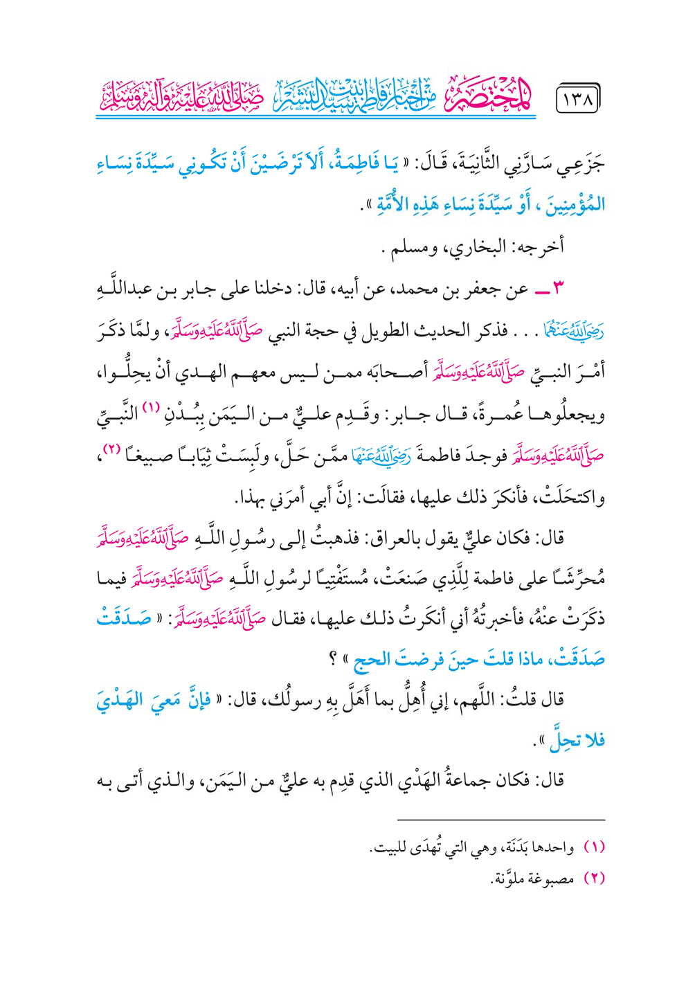 ٣ ــ عن جعفر بن محمد، عن أبيه، قال: دخلنا على جابر بن عبداللَّهِ - رضي الله عنهما -. . . فذكر الحديث الطويل في حجة النبي - صلى الله عليه وسلم -، ولمَّا ذكَرَ أمْرَ النبيِّ - صلى الله عليه وسلم - أصحابَه ممن ليس معهم الهدي أنْ يحِلُّوا، ويجعلُوها عُمرةً، قال جابر: وقَدِم عليٌّ من اليَمَن بِبُدْنِ (¬١) النَّبيِّ - صلى الله عليه وسلم - فوجدَ فاطمةَ - رضي الله عنها - ممَّن حَلَّ، ولَبِسَتْ ثِيَاباً صبيغاً (¬٢)، واكتحَلَتْ، فأنكرَ ذلك عليها، فقالَت: إنَّ أبي أمرَني بهذا.