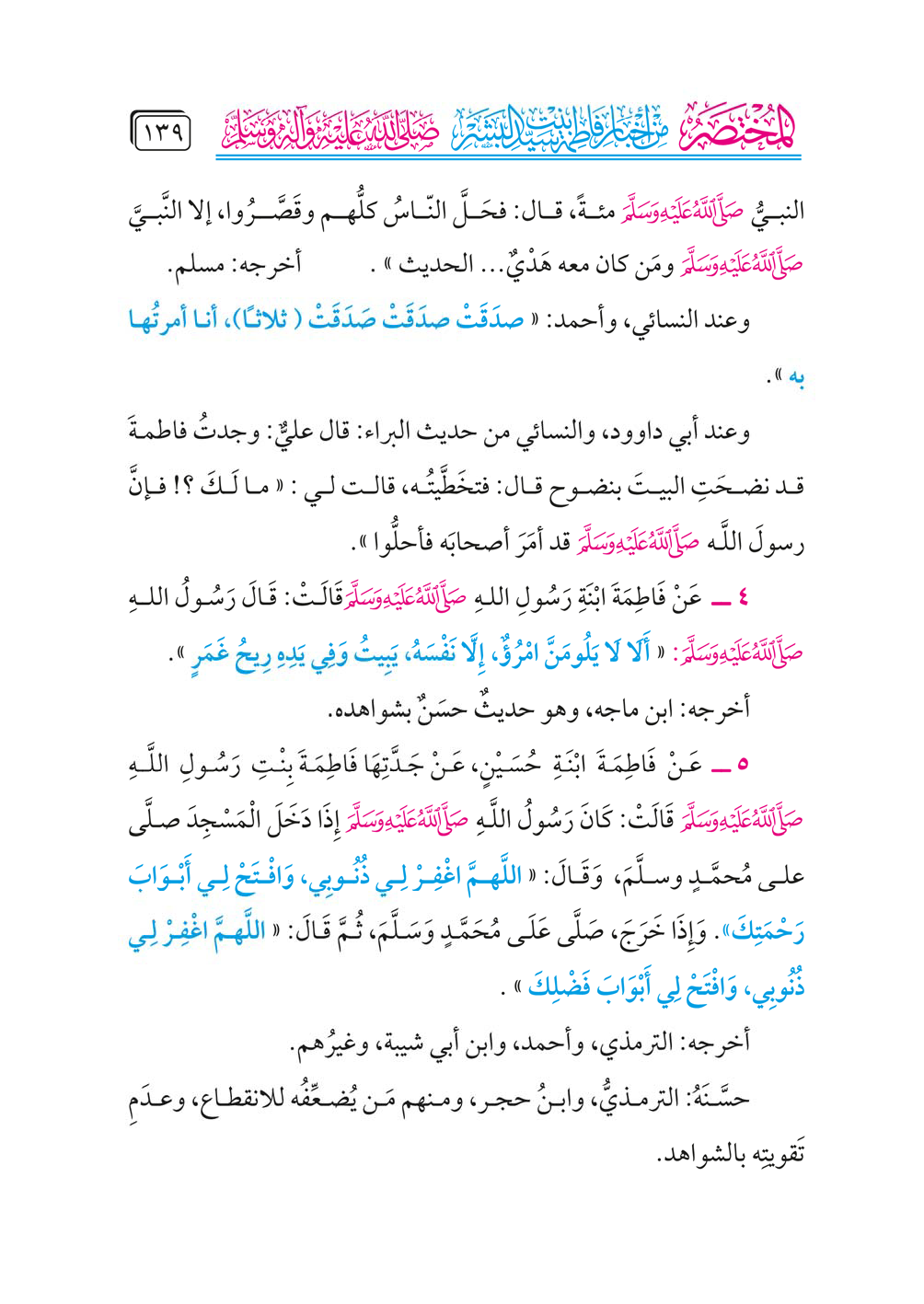 ٤ ــ عَنْ فَاطِمَةَ ابْنَةِ رَسُولِ اللهِ - صلى الله عليه وسلم - قَالَتْ: قَالَ رَسُولُ اللهِ - صلى الله عليه وسلم -: «أَلَا لَا يَلُومَنَّ امْرُؤٌ، إِلَّا نَفْسَهُ، يَبِيتُ وَفِي يَدِهِ رِيحُ غَمَرٍ».
