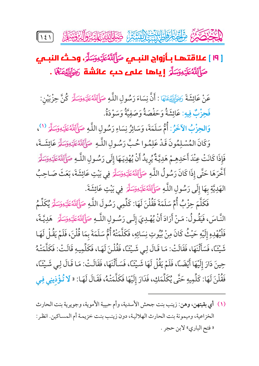 فَكَلَّمَ حِزْبُ أُمِّ سَلَمَةَ فَقُلْنَ لَهَا: كَلِّمِي رَسُولَ اللَّهِ - صلى الله عليه وسلم - يُكَلِّمُ النَّاسَ، فَيَقُولُ: مَنْ أَرَادَ أَنْ يُهْدِيَ إِلَى رَسُولِ اللَّهِ - صلى الله عليه وسلم - هَدِيَّةً، فَلْيُهْدِهِ إِلَيْهِ حَيْثُ كَانَ مِنْ بُيُوتِ نِسَائِهِ، فَكَلَّمَتْهُ أُمُّ سَلَمَةَ بِمَا قُلْنَ، فَلَمْ يَقُلْ لَهَا شَيْئَاً، فَسَأَلْنَهَا، فَقَالَتْ: مَا قَالَ لِي شَيْئَاً، فَقُلْنَ لَهَا، فَكَلِّمِيهِ قَالَتْ: فَكَلَّمَتْهُ حِينَ دَارَ إِلَيْهَا أَيْضَاً، فَلَمْ يَقُلْ لَهَا شَيْئَاً، فَسَأَلْنَهَا، فَقَالَتْ: مَا قَالَ لِي شَيْئَاً، فَقُلْنَ لَهَا: كَلِّمِيهِ حَتَّى يُكَلِّمَكِ، فَدَارَ إِلَيْهَا فَكَلَّمَتْهُ، فَقَالَ لَهَا: «لَا تُؤْذِينِي فِي