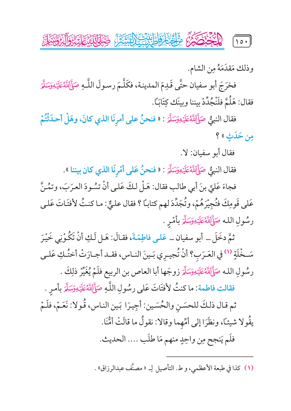 ثم قال ذلكَ للحسَنِ والحُسَين: أجِيرَا بَين الناس، قُولا: نَعَمْ، فلَمْ يقُولا شيئاً، ونظَرَا إلى أمِّهِما وقالا: نقولُ ما قالَتْ أمُّنَا.