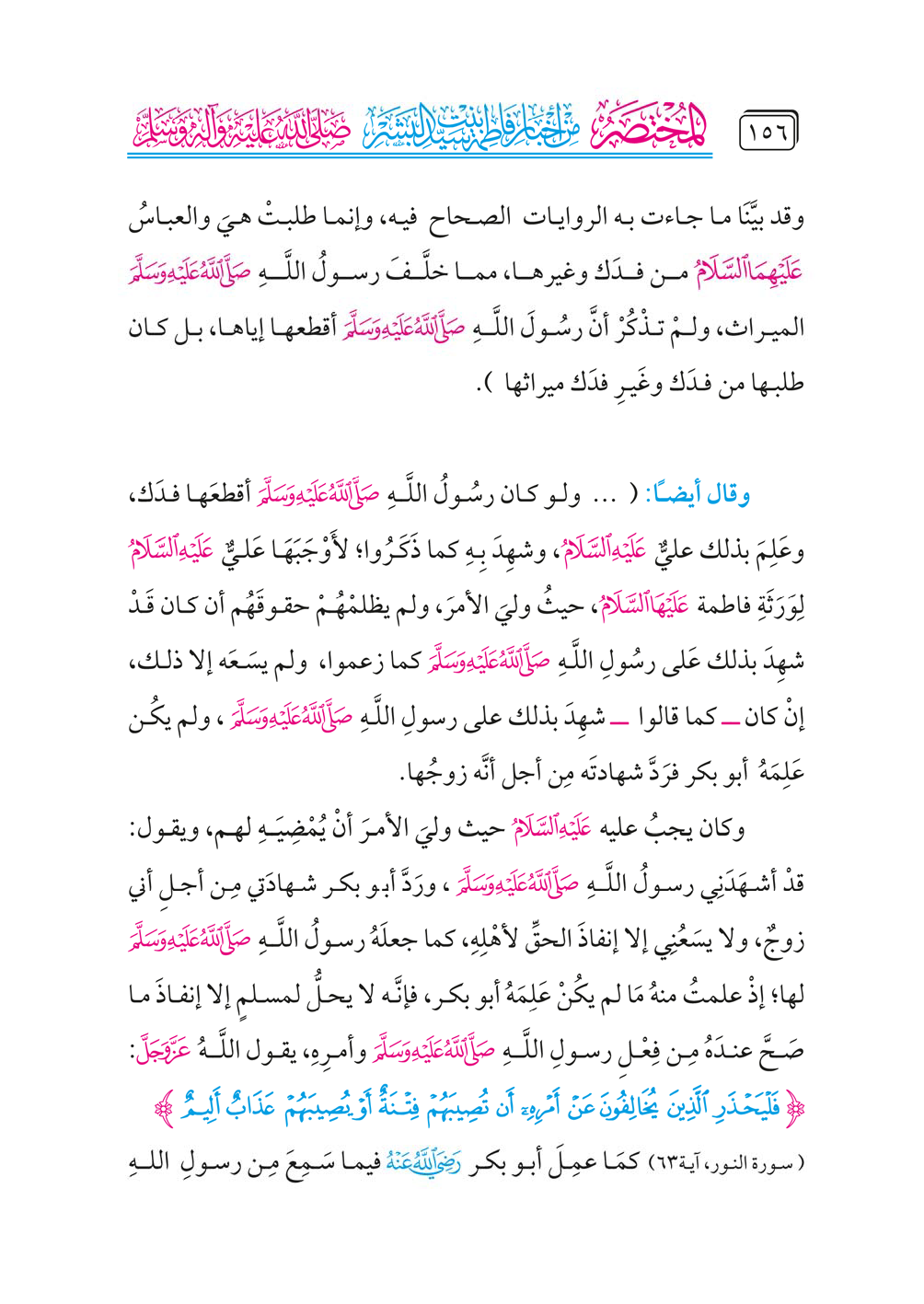وكان يجبُ عليه - عليه السلام - حيث وليَ الأمرَ أنْ يُمْضِيَهِ لهم، ويقول: قدْ أشهَدَنِي رسولُ اللَّهِ - صلى الله عليه وسلم -، ورَدَّ أبو بكر شهادَتي مِن أجلِ أني زوجٌ، ولا يسَعُنِي إلا إنفاذَ الحقِّ لأهْلِهِ، كما جعلَهُ رسولُ اللَّهِ - صلى الله عليه وسلم - لها؛ إذْ علمتُ منهُ مَا لم يكُنْ عَلِمَهُ أبو بكر، فإنَّه لا يحلُّ لمسلمٍ إلا إنفاذَ ما صَحَّ عندَهُ مِن فِعْلِ رسولِ اللَّهِ - صلى الله عليه وسلم - وأمرِهِ، يقول اللَّهُ - عز وجل -: {فَلْيَحْذَرِ الَّذِينَ يُخَالِفُونَ عَنْ أَمْرِهِ أَنْ تُصِيبَهُمْ فِتْنَةٌ أَوْ يُصِيبَهُمْ عَذَابٌ أَلِيمٌ} (سورة النور، آية ٦٣) كمَا عمِلَ أبو بكر - رضي الله عنه - فيما سَمِعَ مِن رسولِ اللهِ