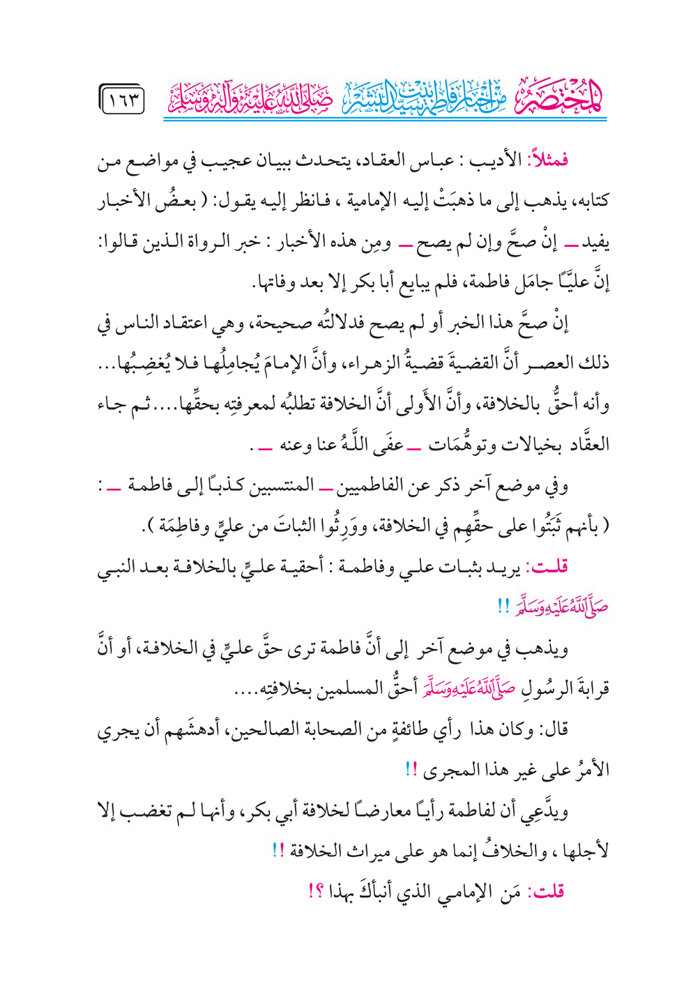 إنْ صحَّ هذا الخبر أو لم يصح فدلالتُه صحيحة، وهي اعتقاد الناس في ذلك العصر أنَّ القضيةَ قضيةُ الزهراء، وأنَّ الإمامَ يُجامِلُها فلا يُغضِبُها وأنه أحقُّ بالخلافة، وأنَّ الأَولى أنَّ الخلافة تطلبُه لمعرفتِه بحقِّها. ثم جاء العقَّاد بخيالات وتوهُّمَات ــ عفَى اللَّهُ عنا وعنه ــ.