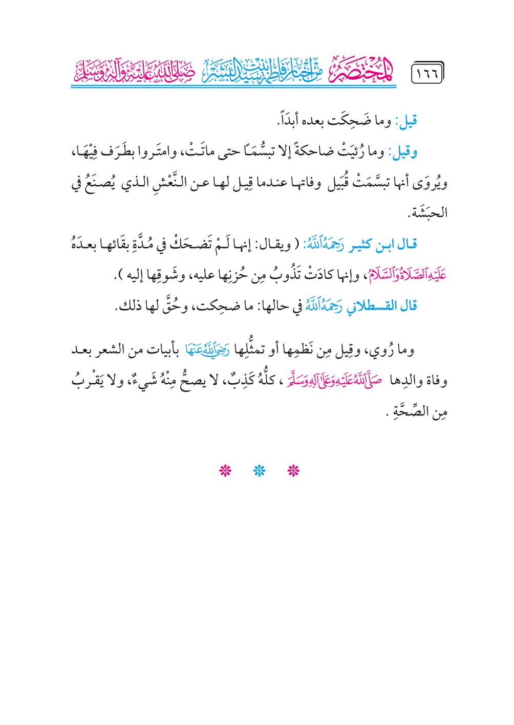 وقيل: وما رُئيَتْ ضاحكةً إلا تبسُّمَاً حتى ماتَتْ، وامتَروا بطَرَف فِيْهَا، ويُروَى أنها تبسَّمَتْ قُبَيل وفاتها عندما قِيل لها عن النَّعْشِ الذي يُصنَعُ في الحبَشَة.
