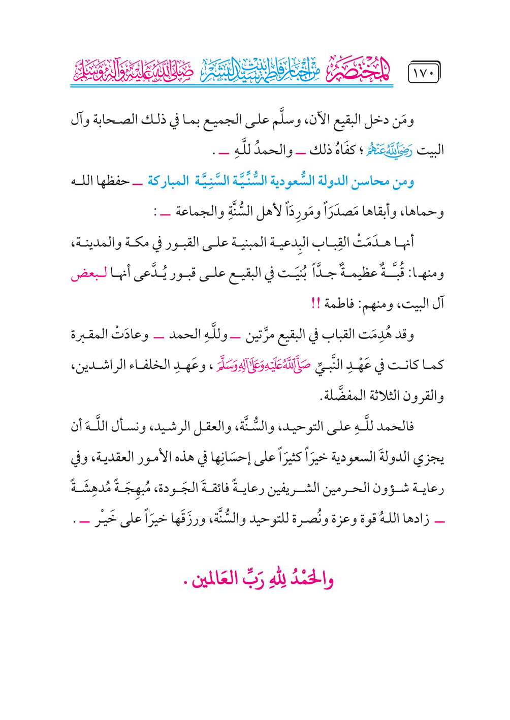 فالحمد للَّهِ على التوحيد، والسُّنَّة، والعقل الرشيد، ونسأل اللَّهَ أن يجزي الدولةَ السعودية خيرَاً كثيرَاً على إحسَانِها في هذه الأمور العقدية، وفي رعاية شؤون الحرمين الشريفين رعايةً فائقةَ الجَودة، مُبهِجَةً مُدهِشَةً ــ زادها اللهُ قوة وعزة ونُصرة للتوحيد والسُّنَّة، ورزَقَها خيرَاً على خَيْر ــ.