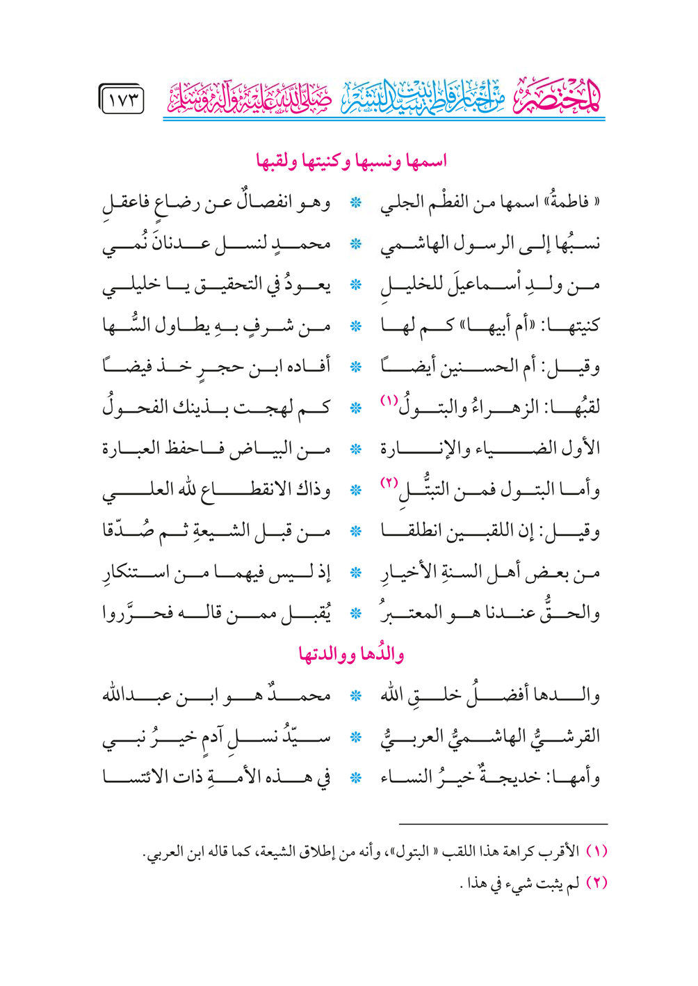 «فاطمةُ» اسمها من الفطْم الجلي ... وهو انفصالٌ عن رضاعٍ فاعقل